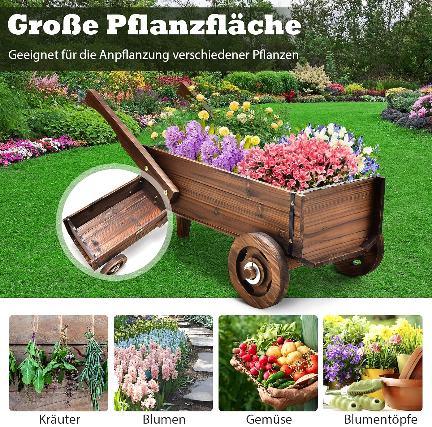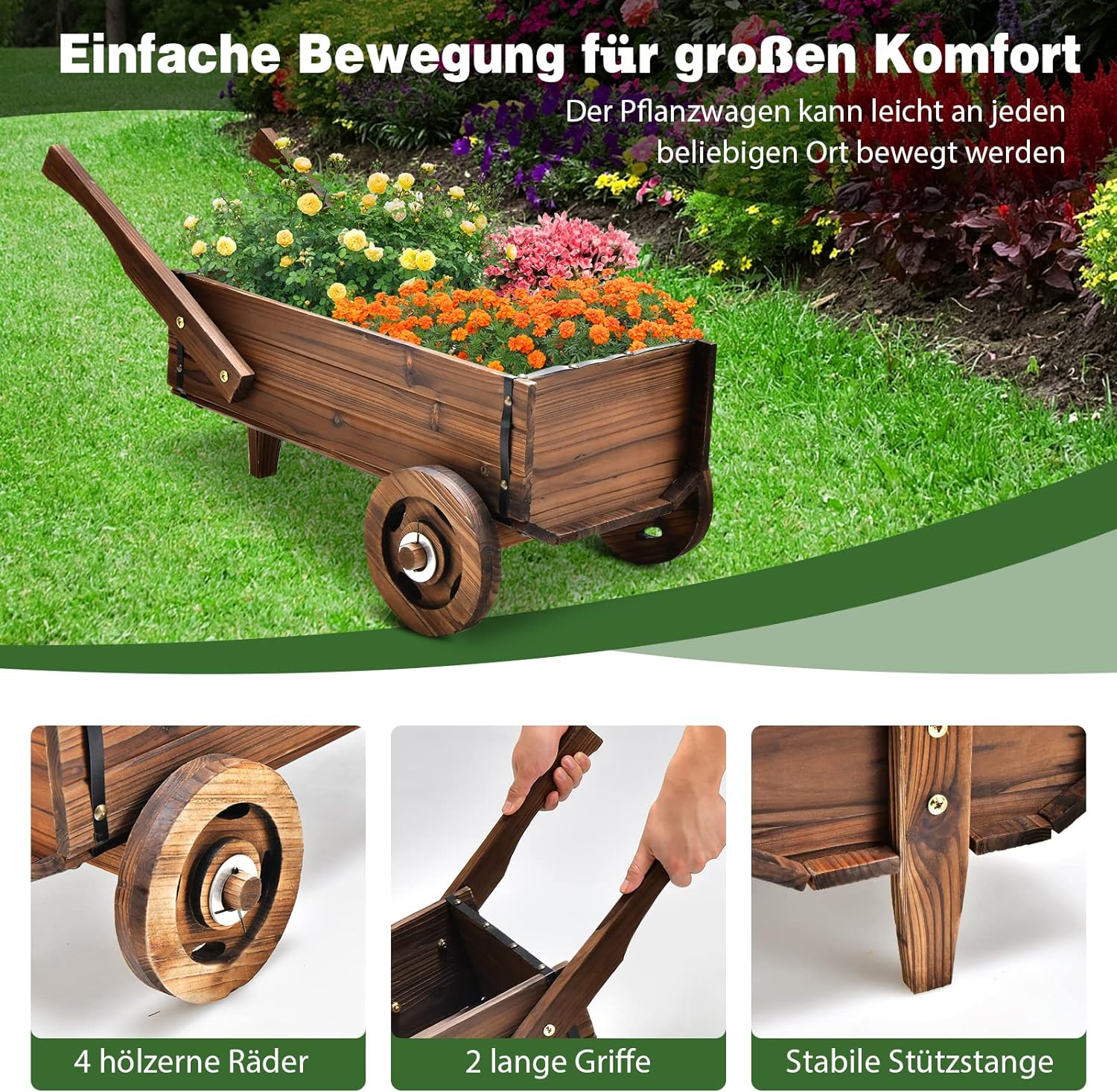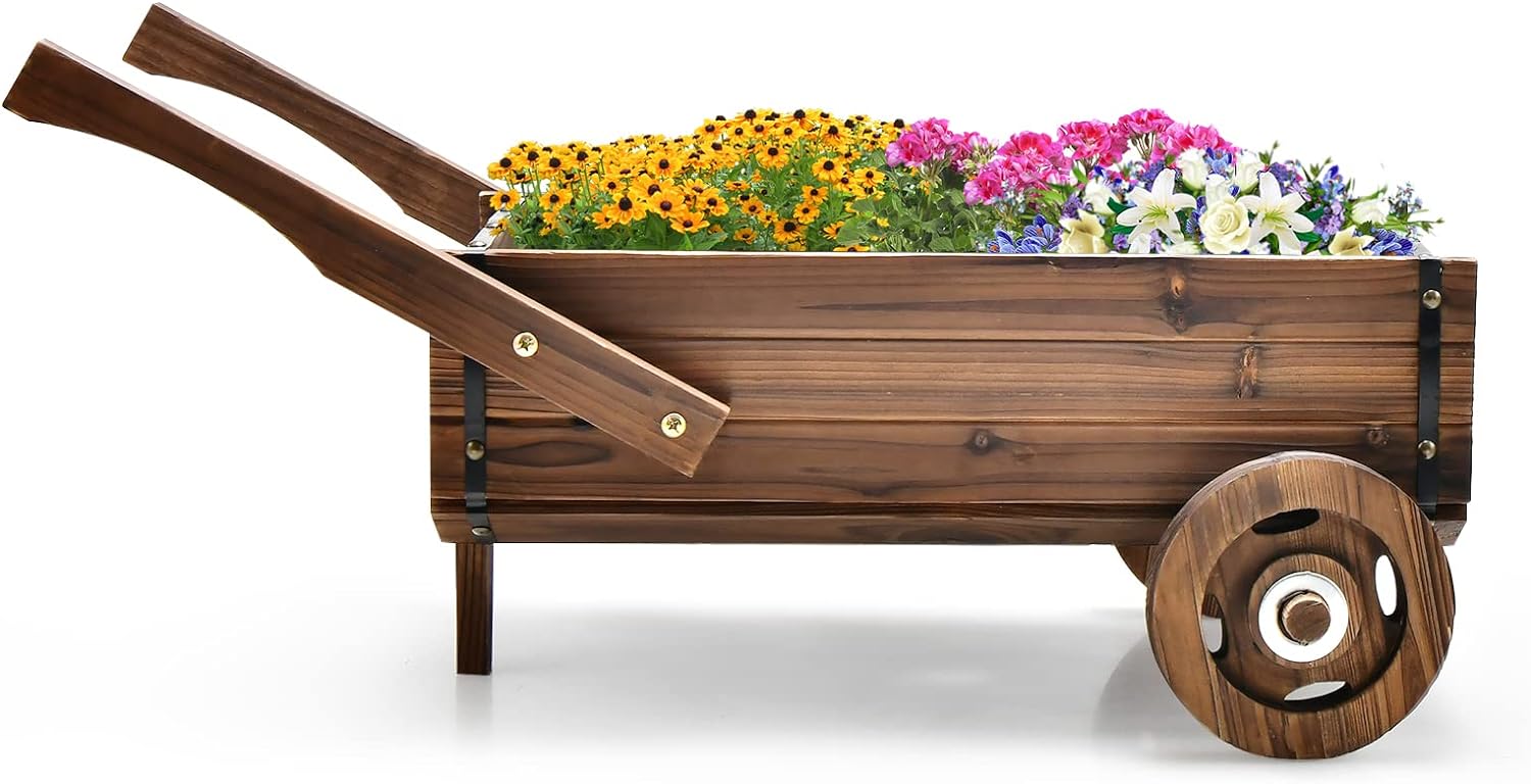 - 【Funktionelles und schönes Design】 Der Holzwagen wird mit einer tiefen Pflanzkiste zum Anbau von Blumen, Kräutern, Gemüse, Obst und mehr geliefert. Darüber hinaus kann er mit seinem rustikalen Aussehen und den exquisiten Holzmaserungen auch eine