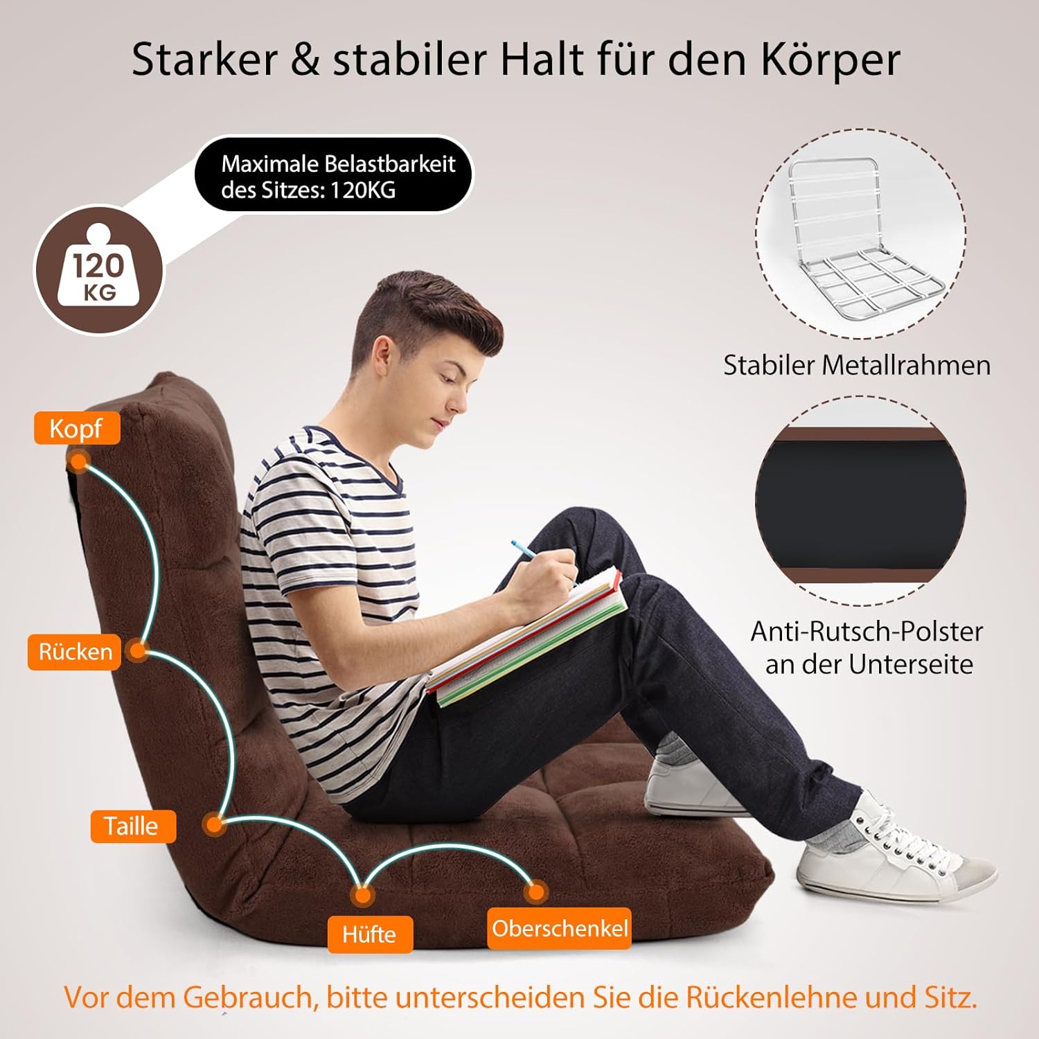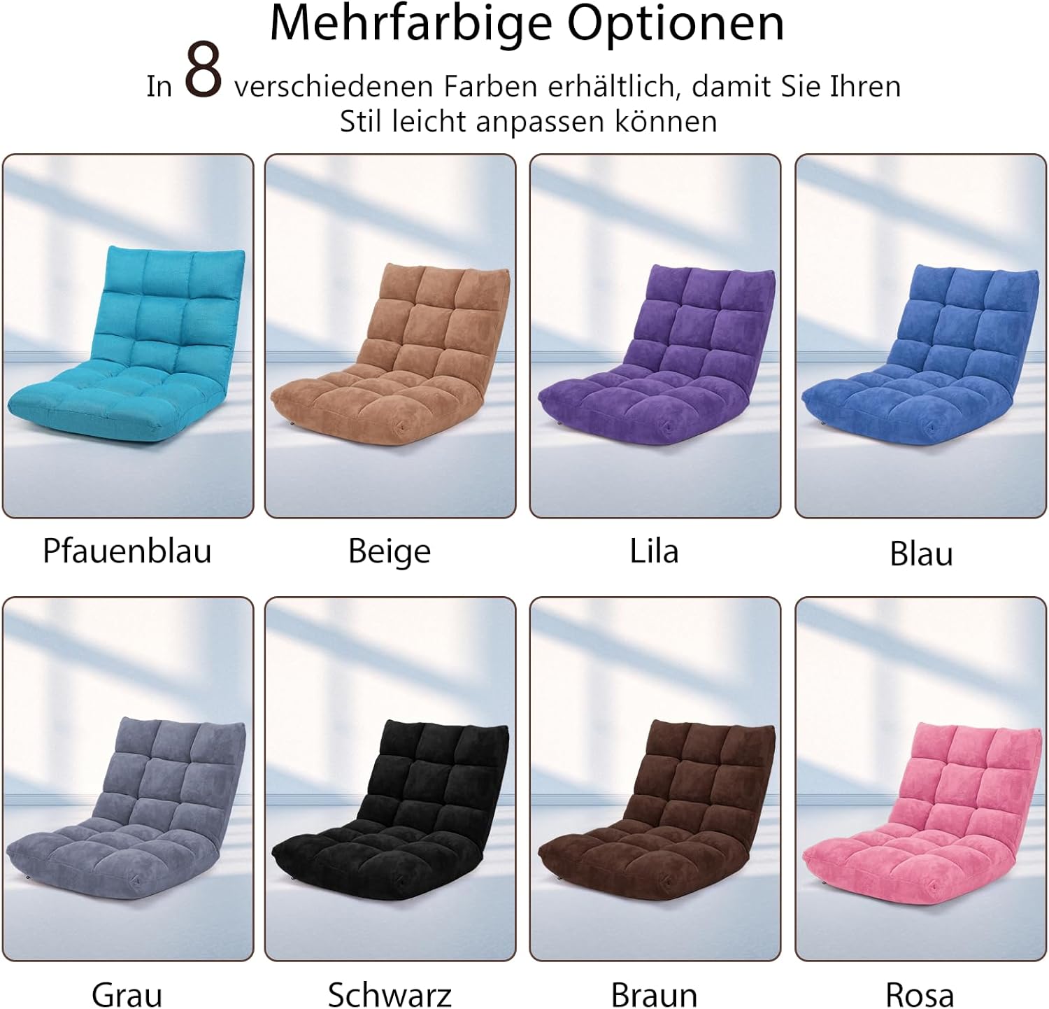 - 【Verstellbarer Rückenlehne】Der verstellbare Sofastuhl bietet Ihnen 14 verschiedenen Positionen, damit Sie nach eigenem Bedürfnis wählen können. Das Bodenkissen passt sich ihrem Körper ideal an, und bietet dadurch maximalen Liege- und Sitzkomfort.