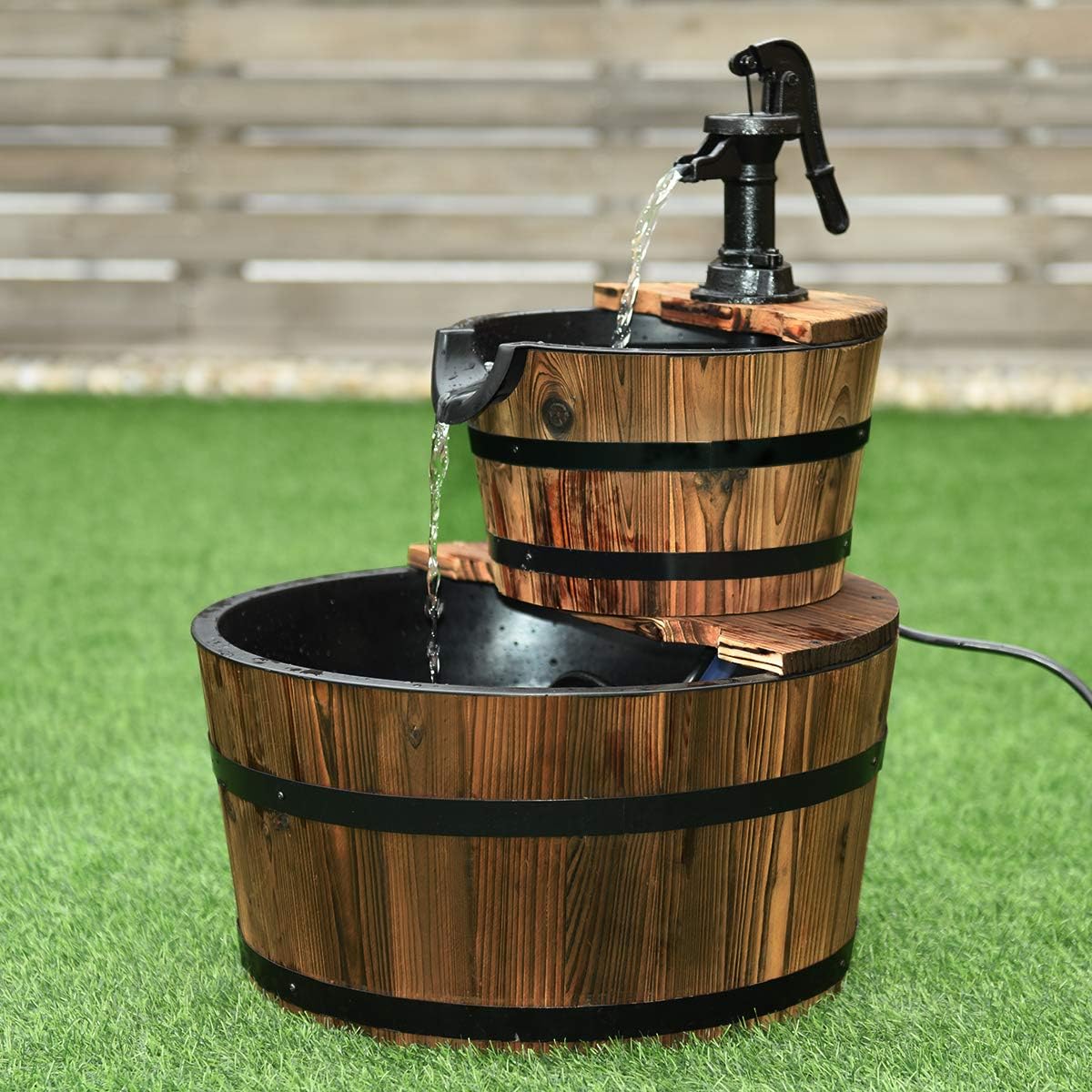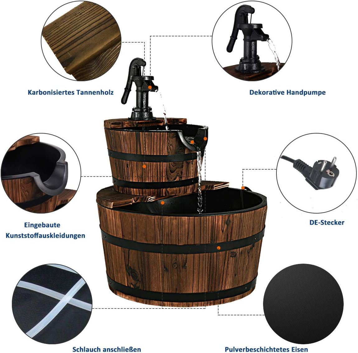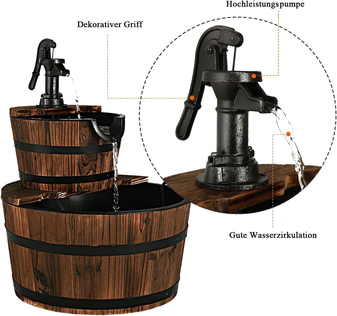 - 【Grossartige Outdoor Dekoration】Das einzigartige 2-Ebenen Design aus Fässern verleiht Ihrem Garten eine rustikale und elegante Atmosphäre. Das fliessende Wasser sorgt derweil sowohl für eine schöne optische als auch akustische Umgebung. Darüber hinaus wird der Brunnen kleinere Tiere wie Vögel und Eichhörnchen dazu einladen, Ihren Garten zu besuchen.