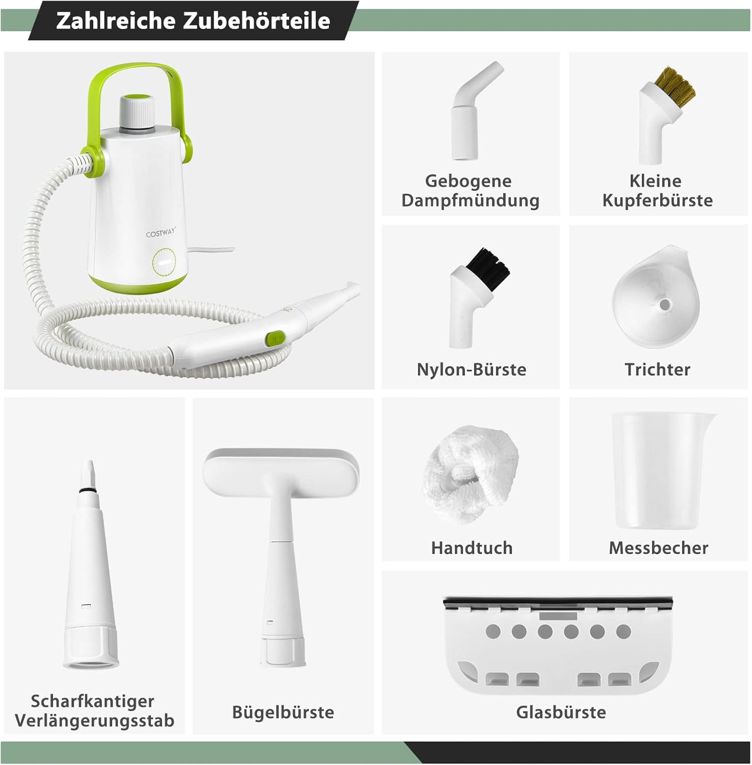- 【Umfangreiches Zubehör】Das Paket enthält eine grosse Auswahl an Zubehör, um Ihren unterschiedlichen Anforderungen gerecht zu werden. Ein Glasreinigungsaufsatz für Fenster oder Spiegel ist im Lieferumfang enthalten. Ein Textildampfkopf für Sofas
