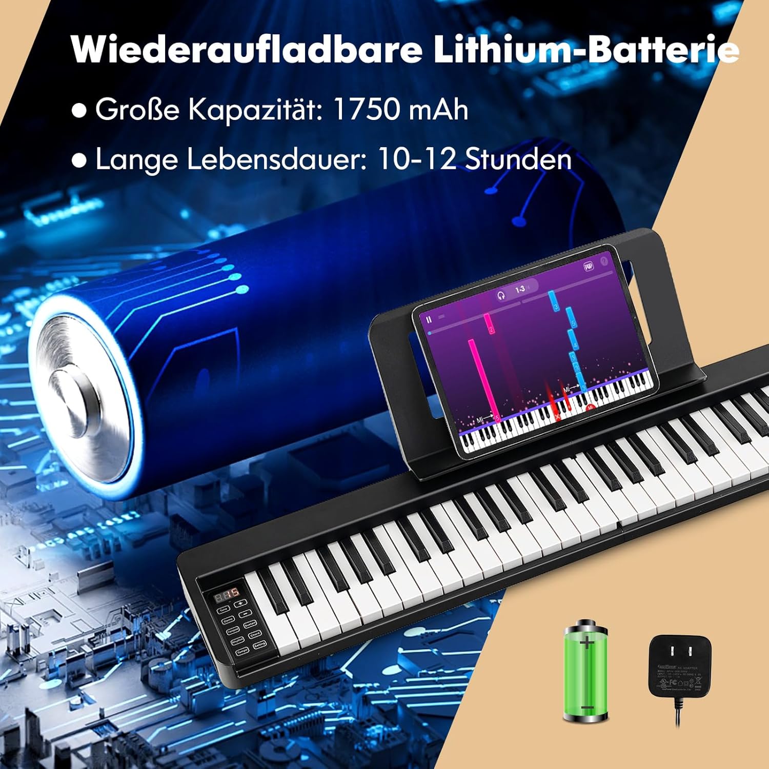 - 【Wiederaufladbarer Lithium-Akku】Das tragbare E-Piano ist mit einem Akku mit einer grossen Kapazität von 1750 mAh ausgestattet und bietet eine lange Laufzeit von 10–12 Stunden. So können Sie Tag für Tag zu Hause, in der Schule oder auf Reisen