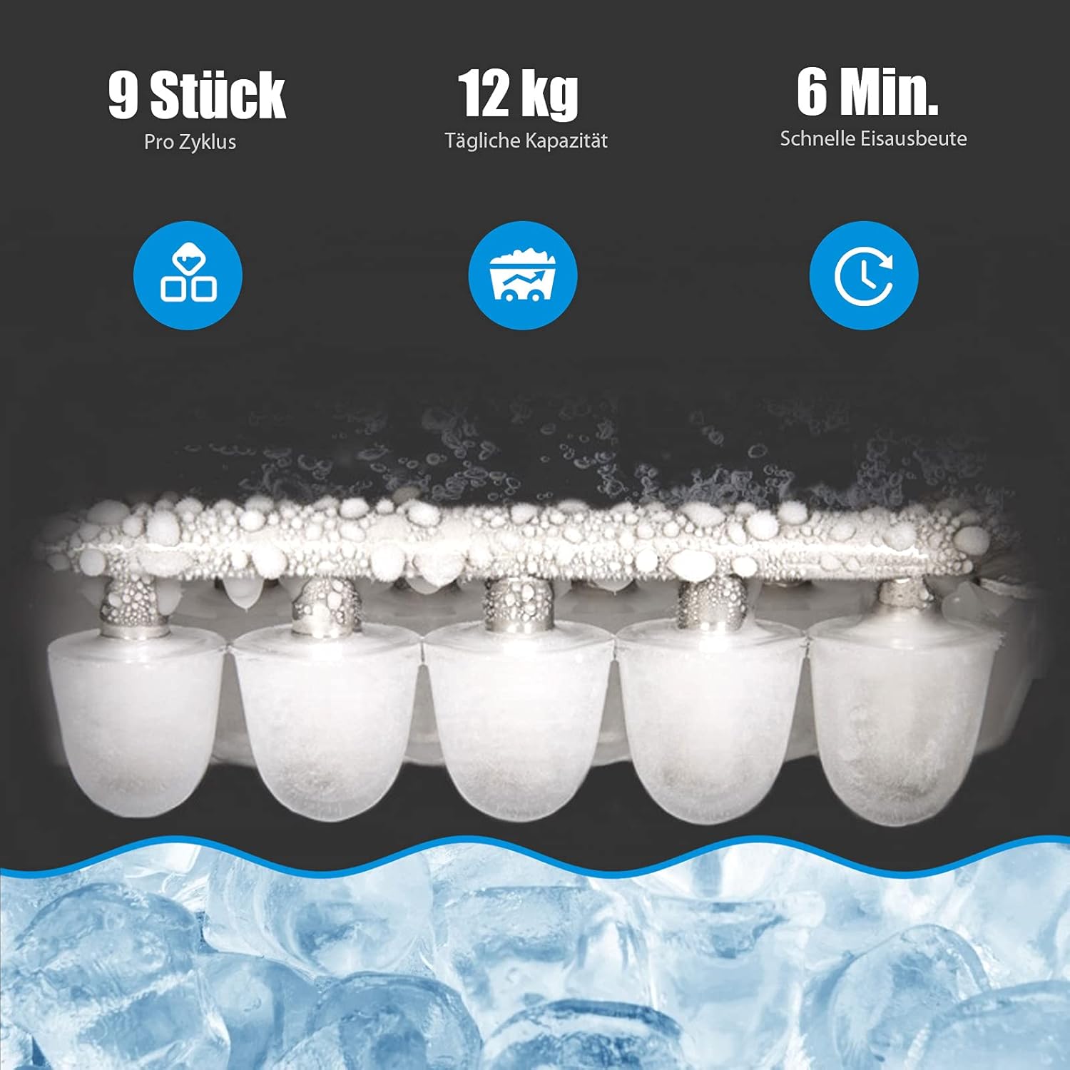 - ❄️【Schnelle & effiziente Eiszubereitung 】Ausgestattet mit einem leistungsstarken Kompressor, 9 korrosionsbeständigen Kondensatoren und einem 2,2 Liter Wassertank ist das Gerät leise und energieeffizient. In nur 6-13 Minuten produziert es 9