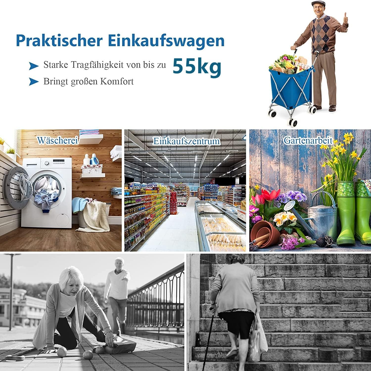 - 【Flexible Bewegung】 Dieser praktische Einkaufswagen ist mit 2 universellen Vorderrädern und 2 festen Hinterrädern ausgestattet, die rutschfest, stossfest und leise sind. Und diese Räder sind für verschiedene Strassen wie Sand, Schnee, Kopfsteinpflaster oder andere Strassenverhältnisse geeignet, um grossen Komfort zu bieten.