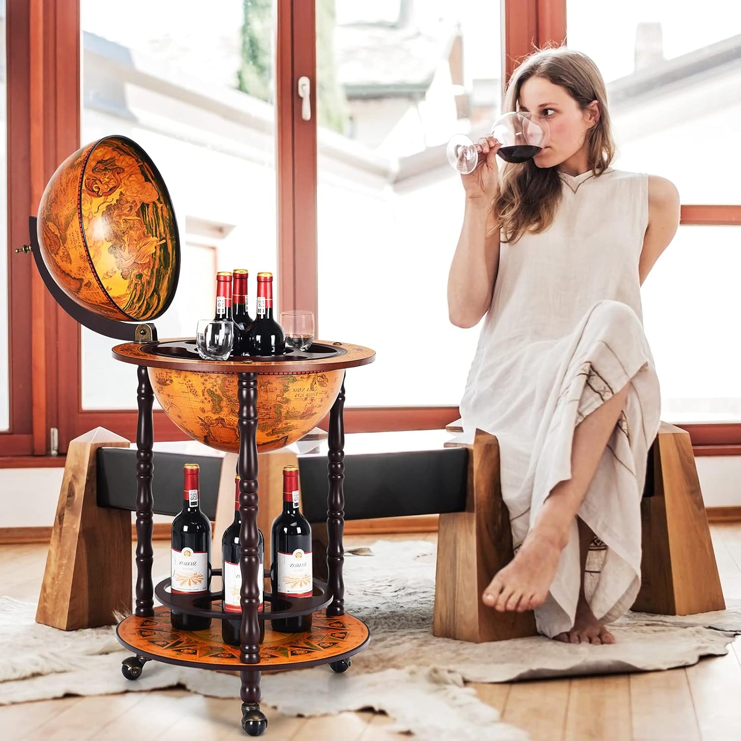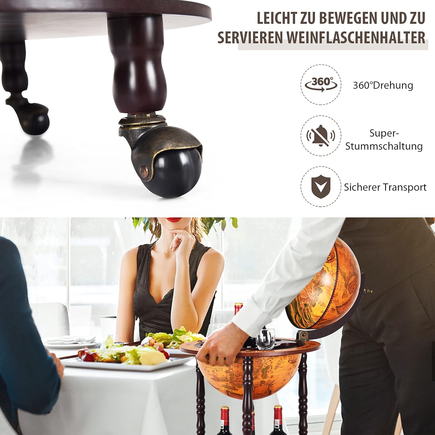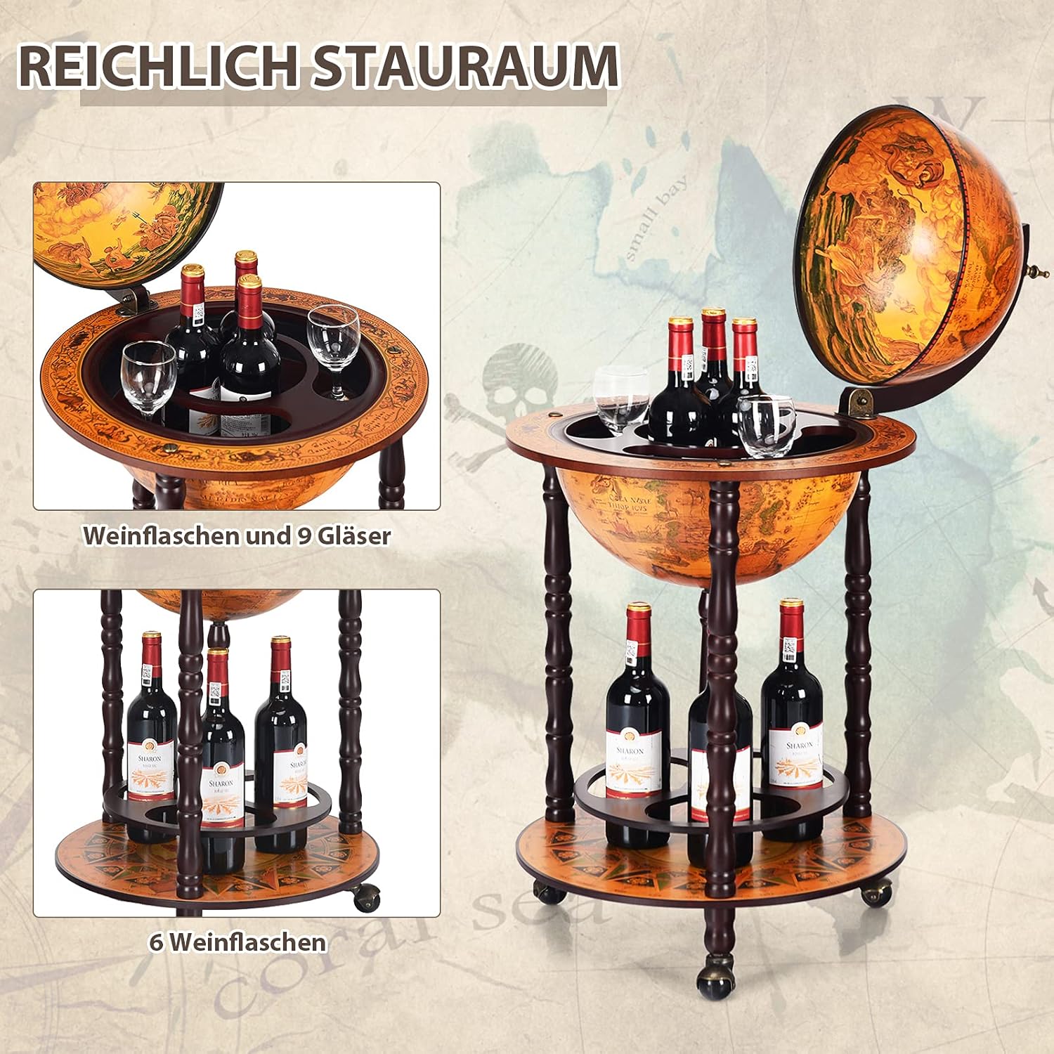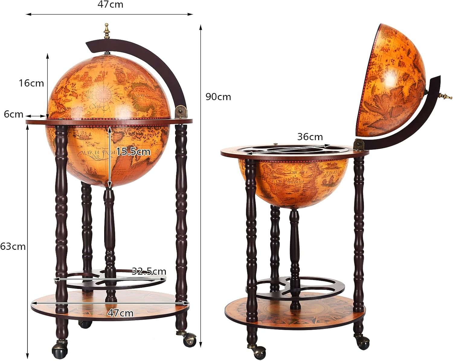 - 【2-stufiges Design】 Mit dem Globus oben und einer Ablage unten bietet Ihnen der Wagenviel Platz zum Verstauen und Präsentieren Ihrer Spirituosen. Dank der Unterteilungen im Globus können dort sowohl Flaschen als auch Gläser aufbewahrt werden.