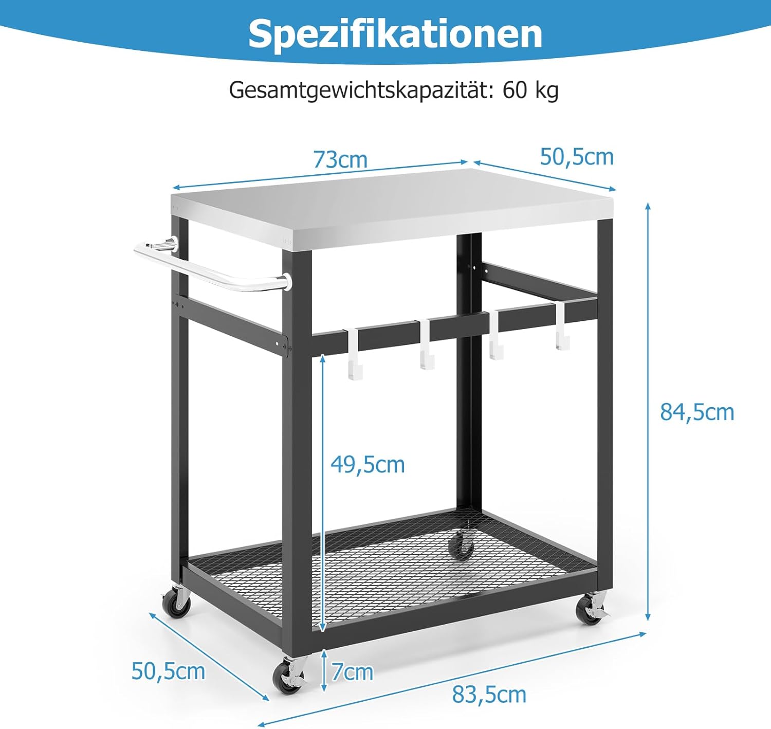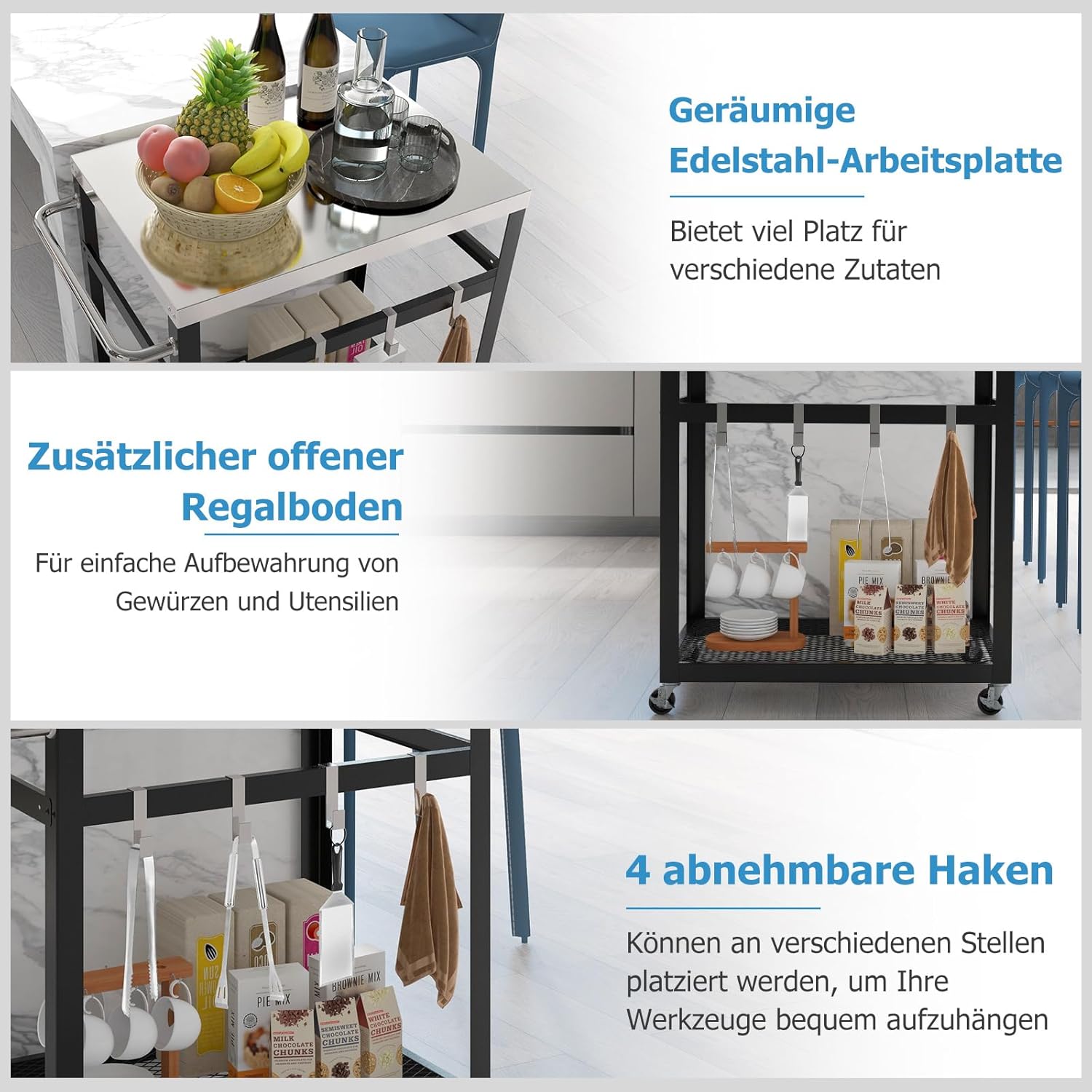 - 【Grosser Stauraum】Die Arbeitsplatte ist geräumig genug, um eine Vielzahl von Zutaten unterzubringen. Und unter dem Wagen gibt es eine zusätzliche Ablagefläche für Obst, Gewürze und Utensilien. Darüber hinaus können 4 zusätzliche Haken an