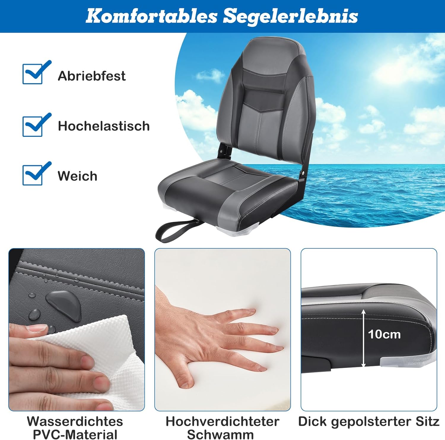 - 【Breites Anwendungsspektrum】Unser Bootssitz in klassischer Schwarz/Blau-Farbe kann gut zu Ihrem Boot oder Yacht passen. Ausserdem ist er ultraportabel und komfortabel und somit ein perfekter Begleiter für Ihre Segel-, Angel- und andere