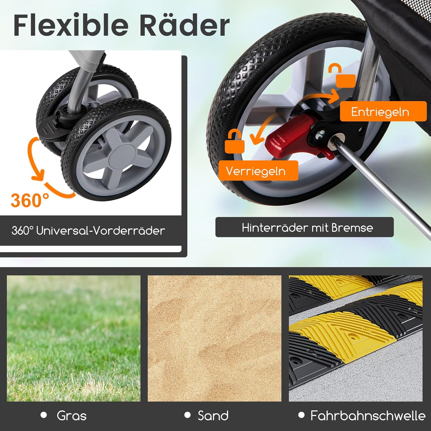 - 【Klappbares Design mit Rädern】Dieser Wagen lässt sich mit einer Hand schnell zusammenklappen und nimmt danach im Auto oder zuhause nur wenig Platz ein. Die 4 stossdämpfenden universellen EVA-Rädern mit Bremsen ermöglichen eine einfache Bewegung.