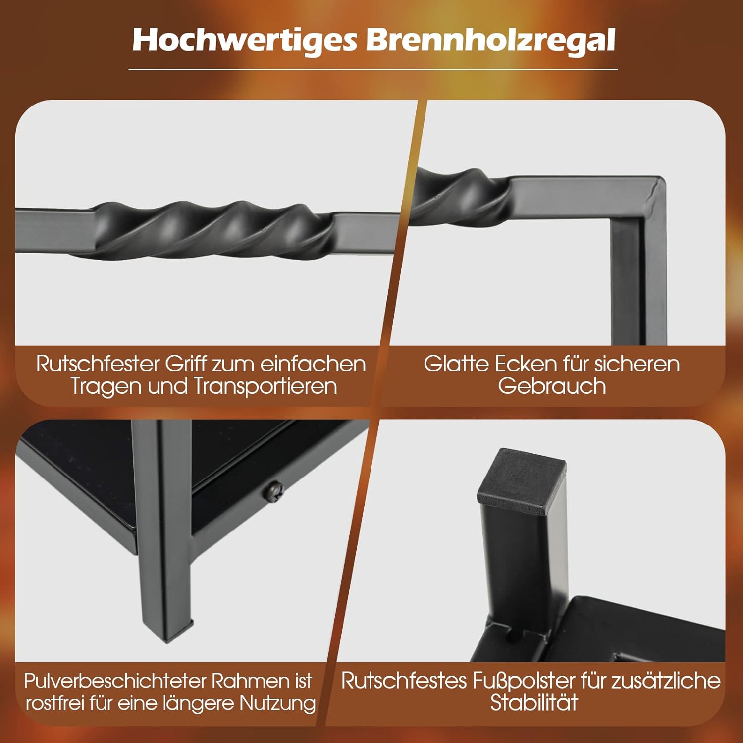- 【Robuste Stahlkonstruktion】Dieses Brennholzregal verfügt über einen stabilen Stahlrahmen und rutschfeste Fusspolster, die eine hervorragende Haltbarkeit und Stabilität gewährleisten. Mit schwarzer Pulverbeschichtung für Rost- und Witterungsbeständigkeit kann der Holzständer ohne besondere Wartung im Innen- und Aussenbereich verwendet werden. Maximale Gewichtskapazität: 50 kg.
