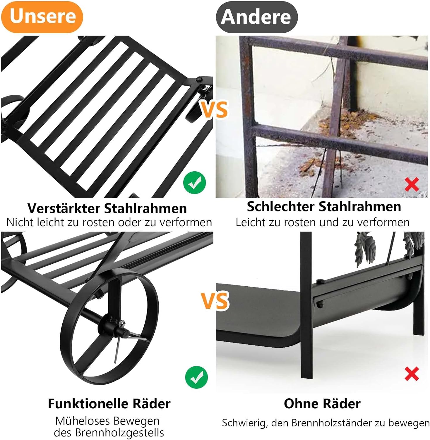 - 【Langlebige Eisen】Dieses Brennholzgestell besteht aus einem verstärkten Eisen und ist von hoher Stabilität und Verformungsbeständigkeit. Und der Gepäckträger kann bis zu 50 kg belasten. Darüber hinaus ist der Eisenrahmen mit Kunststoffbeschichteter Oberfläche auch nach längerem Gebrauch im Freien nicht leicht zu rosten.