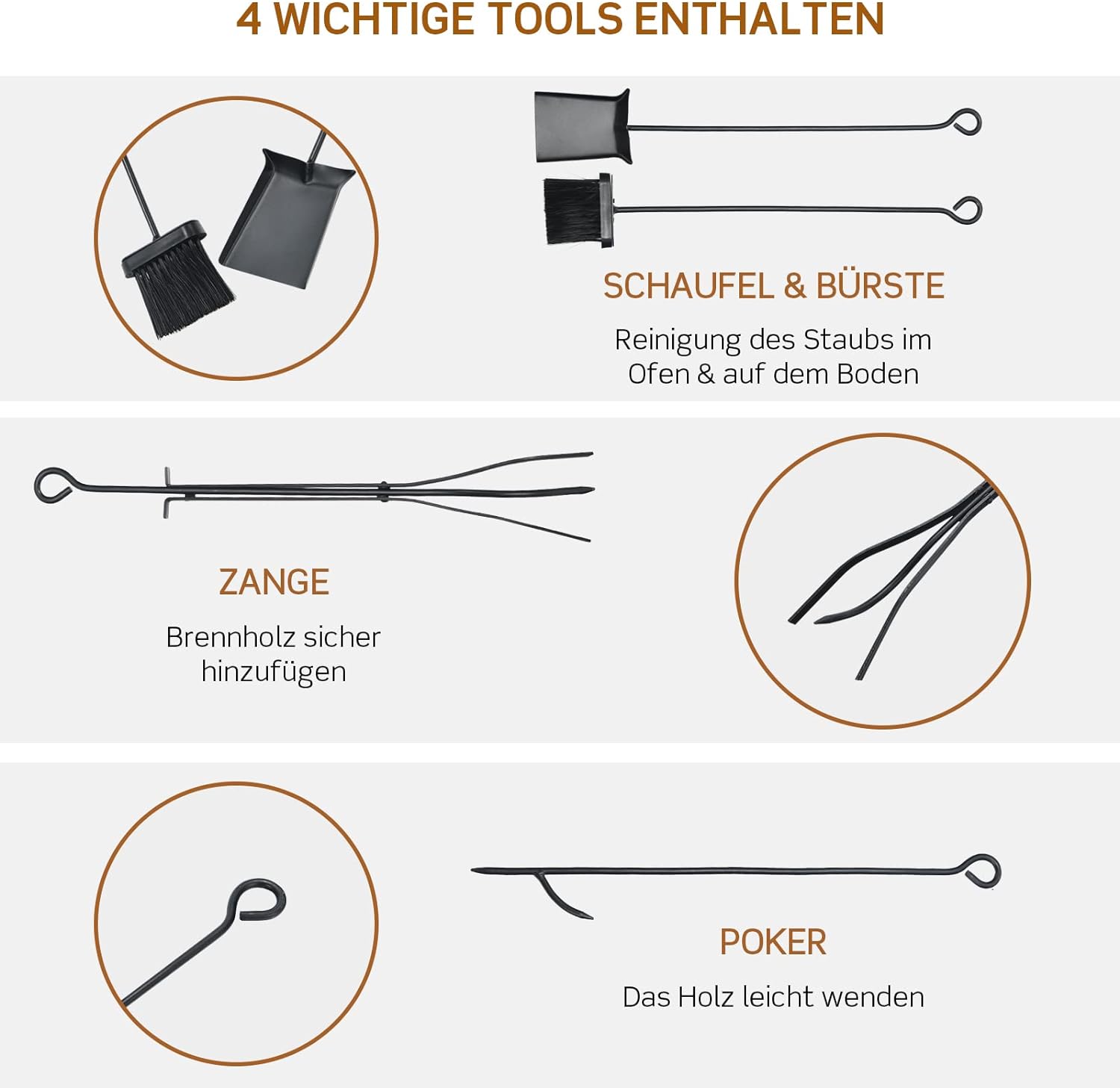 • 【4 notwendige Werkzeuge und Zündholzhalter】 Es gibt 4 zusätzliche passende Werkzeuge, darunter eine Schaufel, eine Bürste, ein Schürhaken und eine Zange. Alle Zubehörteile können an den seitlichen Haken aufgehängt werden, was Wohnraum spart und einen einfachen Zugriff gewährleistet.