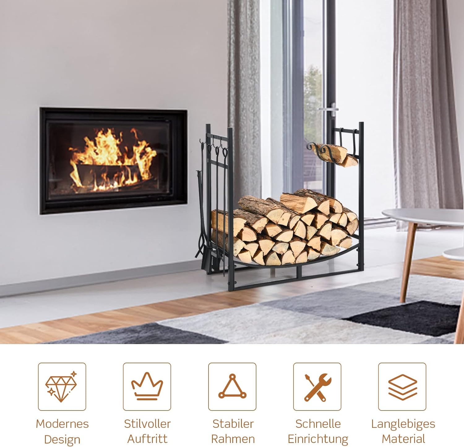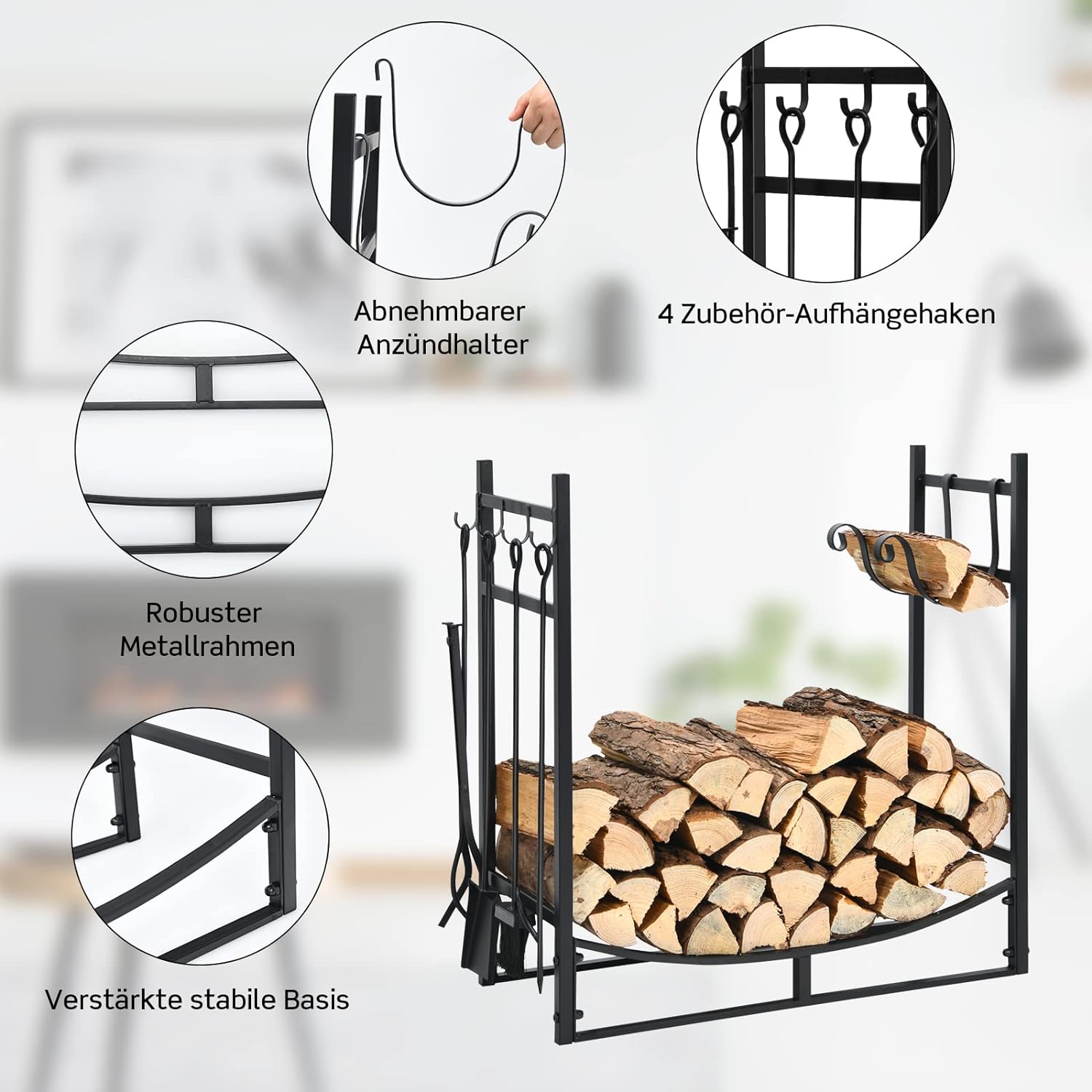 COSTWAY Kaminholzregal mit 4 tlg. Kaminbesteck Set, Brennholzregal Metall Kaminholzständer Kaminzube
