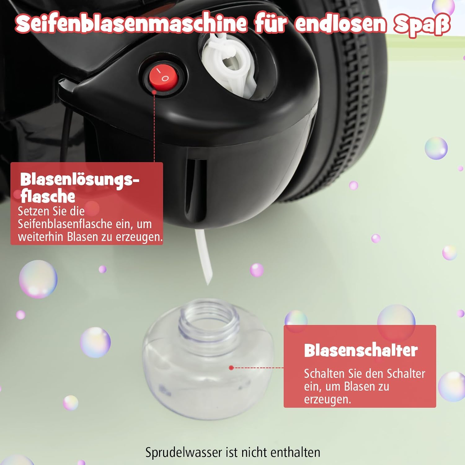 - 【Multifunktionales Auto】 Die Bedienleiste dieses Elektromotors verfügt über einen Musikknopf für zusätzlichen Spass beim Spielen. Zusätzlich ist das Bubble-Auto mit beleuchteten LED-Scheinwerfern für sicheres Spielen in der Nacht ausgestattet