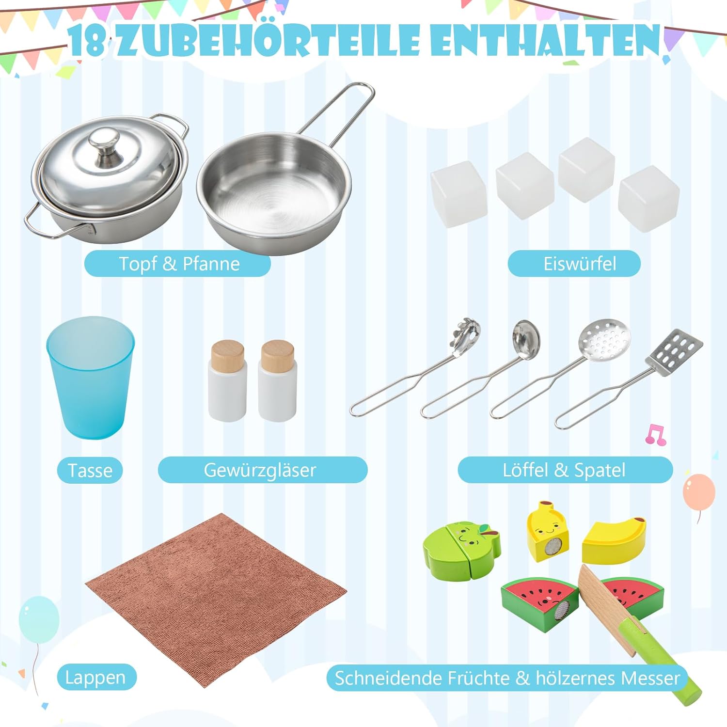 - 【18 Zubehör】Die Spielküche für Kinder ist mit reichhaltigem Zubehör ausgestattet, darunter Töpfe und Pfannen, Löffel und Spatel, Gewürzgläser, Tasse, Eiswürfel, Lappen, Obst zum Schneiden und ein Holzmesser. Viel Stauraum, Haken und