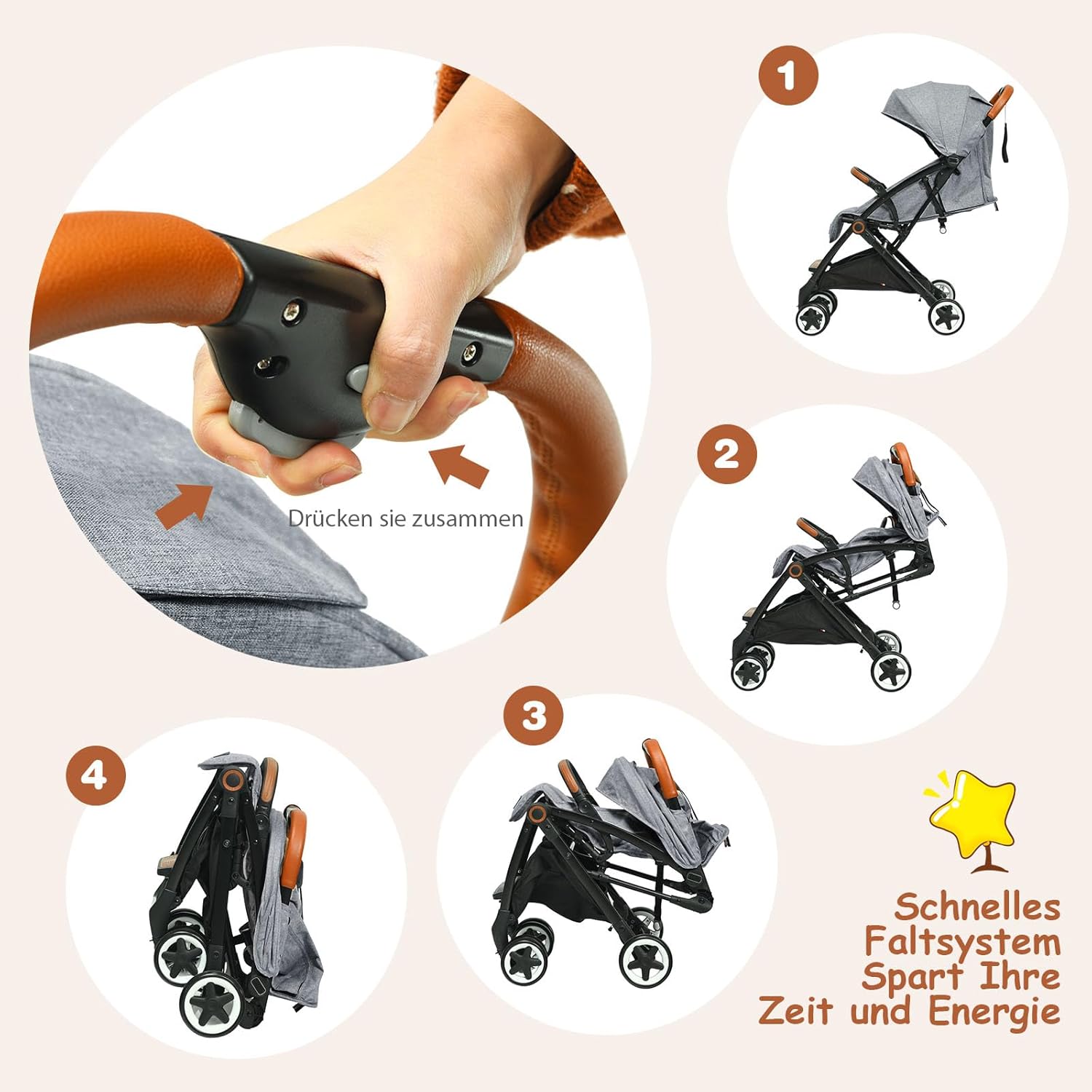 • 👼【Einhändiges Falten】Sie können diesen Babywagen mit einer Hand zusammenklappen, was für Eltern mit Babys im Arm sehr praktisch ist. Nach dem Zusammenklappen gibt es einen Griff zum Tragen. Die Grösse von 52 x 34 x 38 cm kann leicht im
