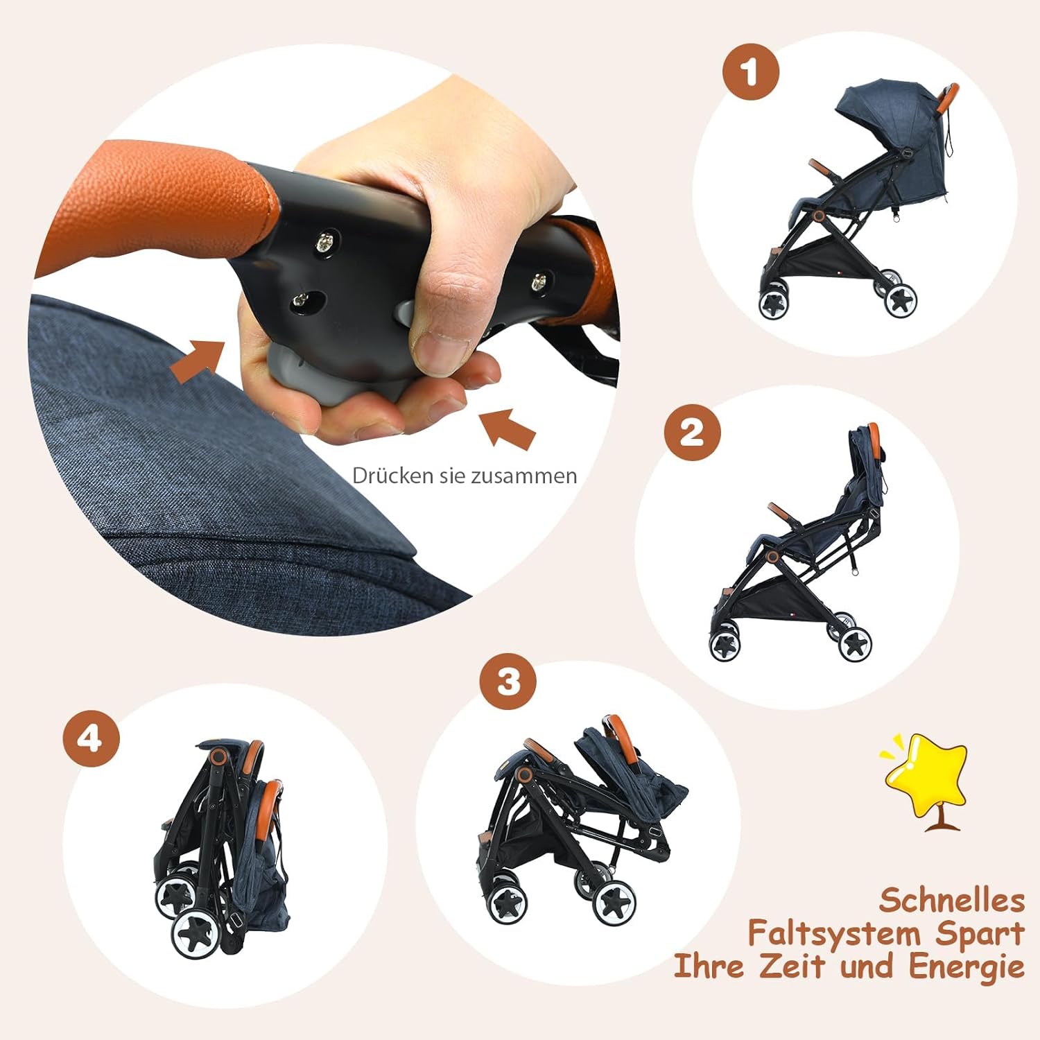 • 👼【Einhändiges Falten】Sie können diesen Babywagen mit einer Hand zusammenklappen, was für Eltern mit Babys im Arm sehr praktisch ist. Nach dem Zusammenklappen gibt es einen Griff zum Tragen. Die Grösse von 52 x 34 x 38 cm kann leicht im