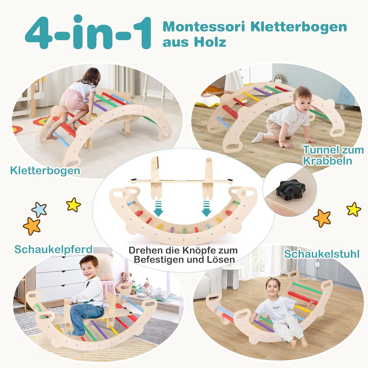- 【Lustiges 4-in-1-Spielset für Kleinkinder】 Dieses Indoor-Spielset kann als Schaukelpferd, Schaukelstuhl, Kletterbogen oder Krabbeltunnel verwendet werden, um Ihr Kind zu unterhalten. Sie können die Knöpfe zum Befestigen und Abnehmen drehen, um es