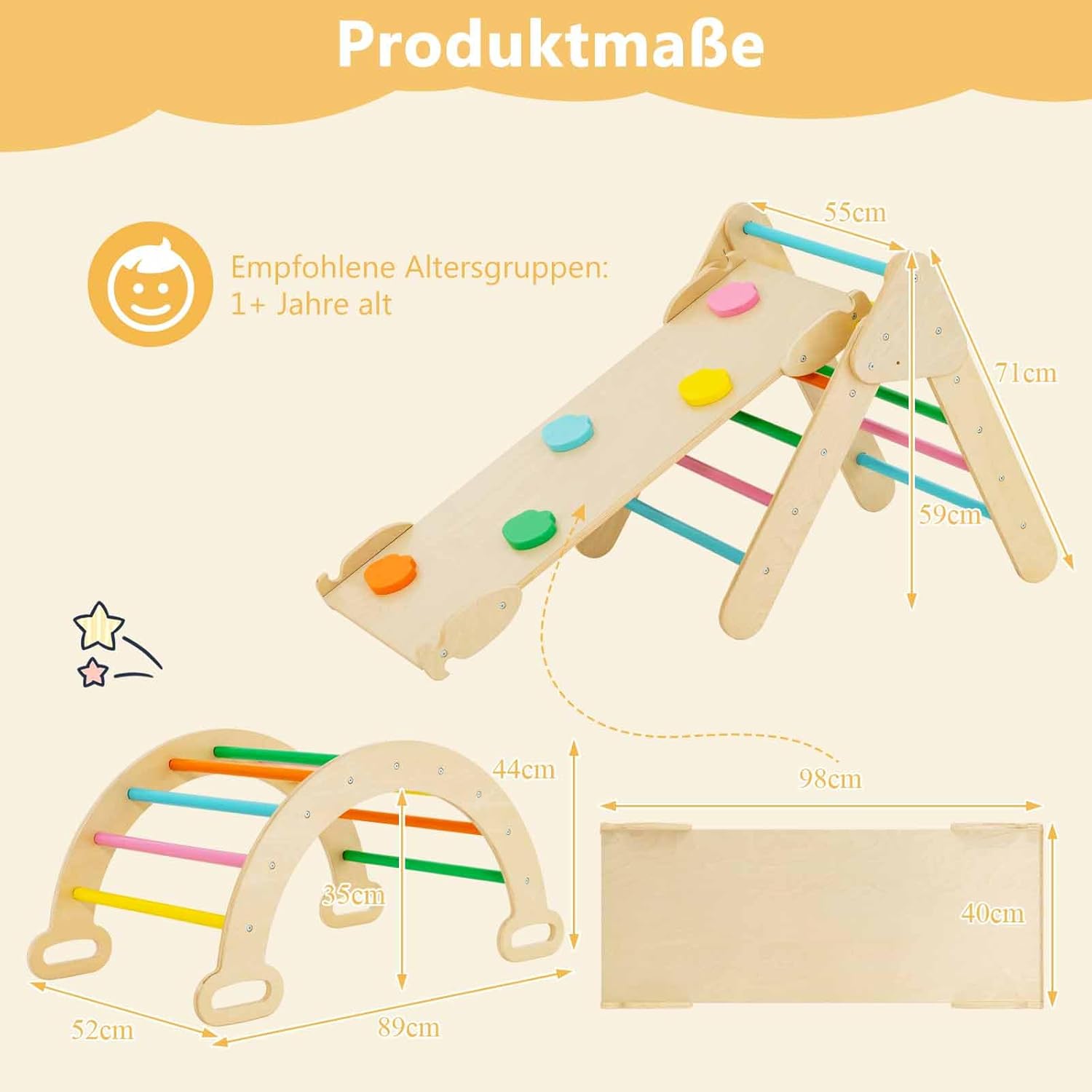 - 【2-in-1 Kletterrampe und Bogen】 Die Rampe verfügt über ein doppelseitiges Design und ermöglicht es Kindern, nach Belieben zu rutschen oder zu klettern. Wenn Sie die Rampe mit dem Kletterdreieck kombinieren, können Sie verschiedene Höhenoptionen