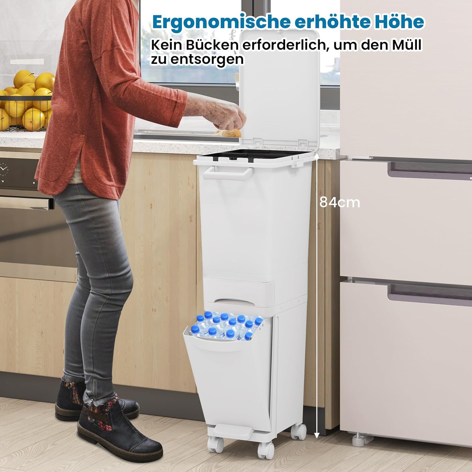 - 【Ergonomische Höhe & Kompakte Grösse: Dank des erhöhten Designs entfällt das Bücken, sodass Sie den Müll bequem entsorgen können. Mit den Massen von 40 x 26 x 84 cm (L x B x H) passt er zudem perfekt in enge Räume.