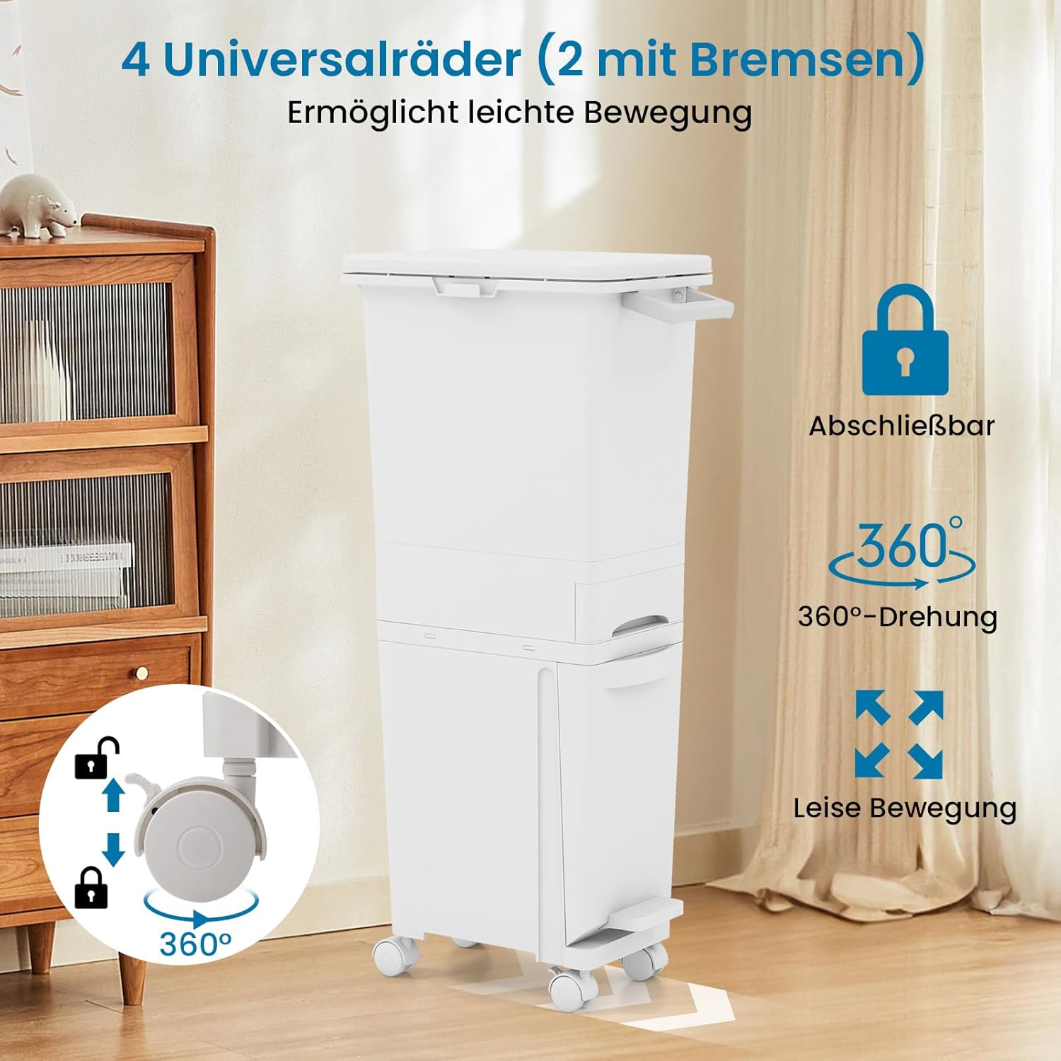 - 【Einfache Bewegung & Breite Anwendung】Ausgestattet mit 4 Universalrädern (2 davon mit Bremsen) für eine reibungslose Fortbewegung, ermöglicht dieser Mülleimer einen einfachen Transport von Raum zu Raum. Er kann in der Küche, im Wohnzimmer oder