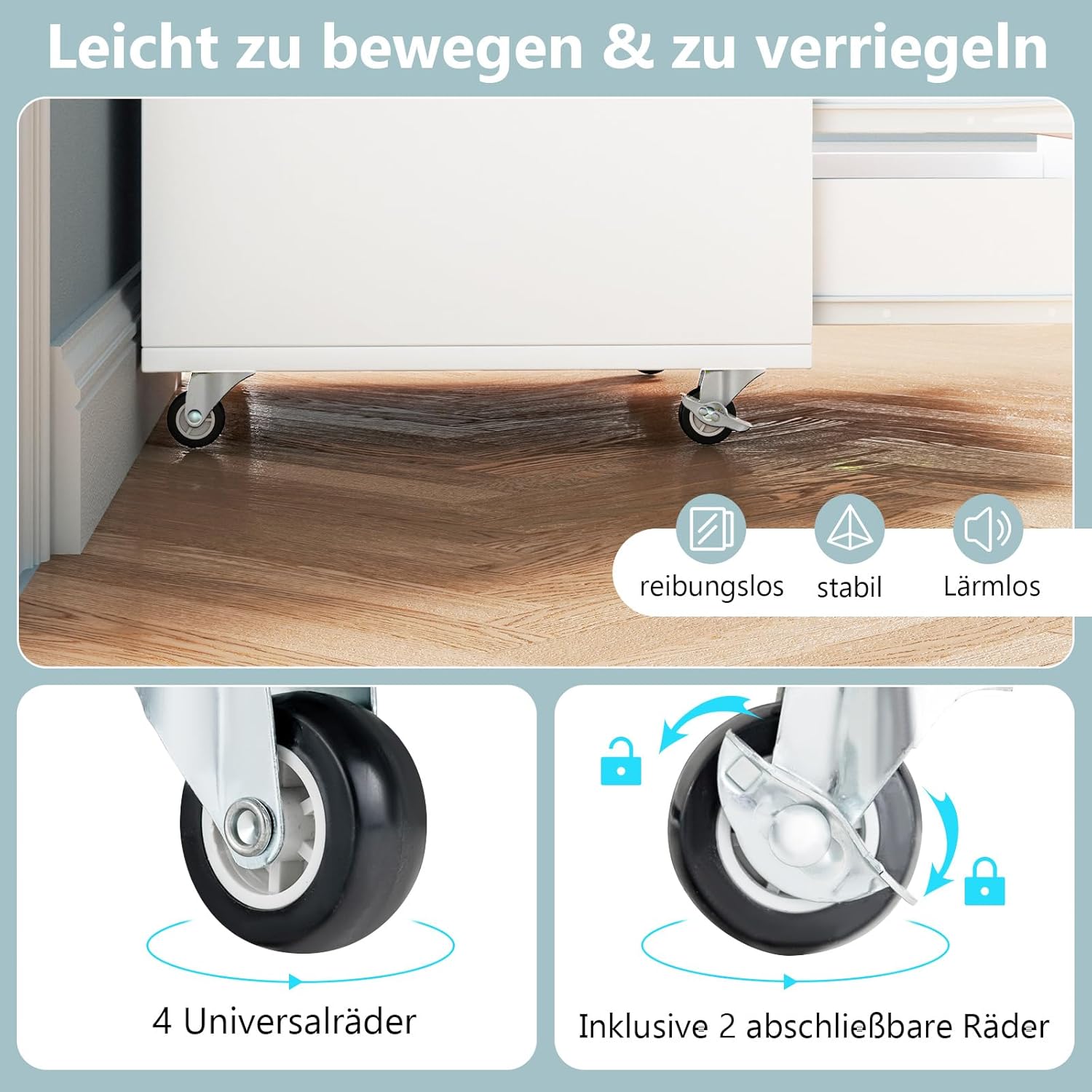 - 【4 praktische Rollen】Durch die vier flexiblen Rollen kann der Schrank überallhin bewegt werden. Zwei von ihnen sind arretierbar, was einen festen Stand ermöglicht. Bei Bedarf können sie jedoch auch abgenommen werden.