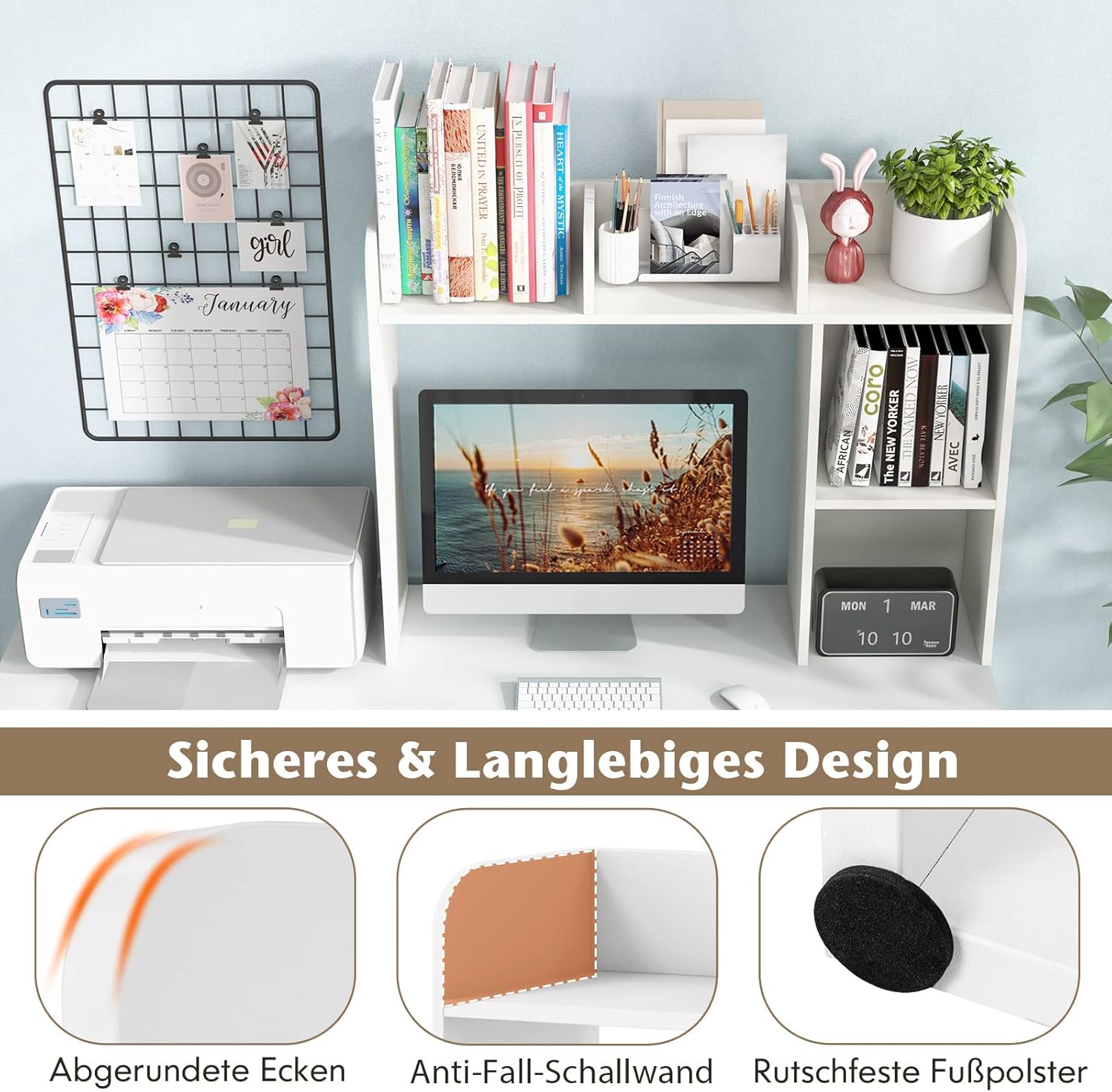 - 【Klassifizierter und vertikaler Stauraum】Um Ihre Tischplatte aufzuräumen und den Platz optimal zu nutzen, bietet Ihnen der Tischplattenstall 3 obere Regale und 2 grosse Seitenfächer, in denen Bücher, Ornamente, Kalender, Pflanzen und andere