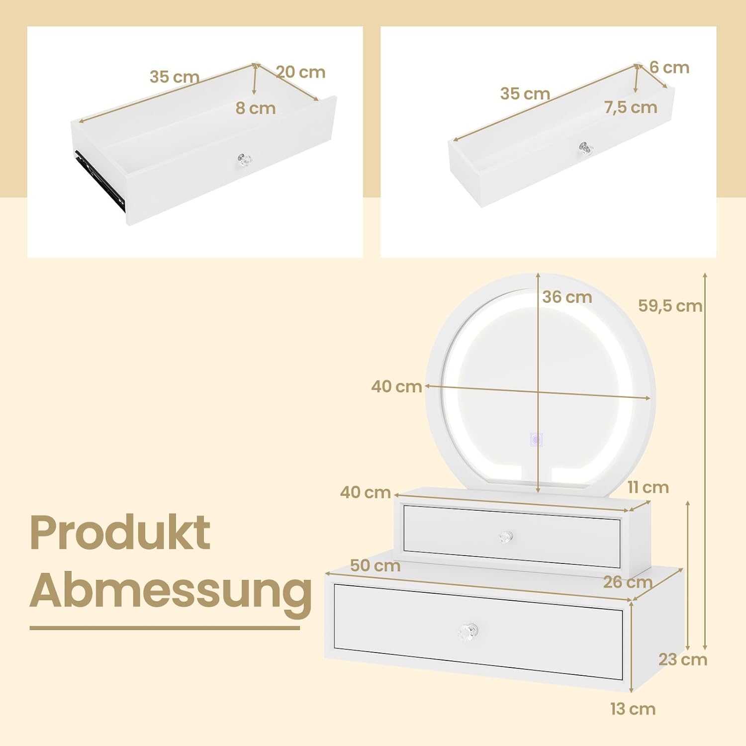 - 【Genügend Stauraum & Freie Anordnung】 Ausgestattet mit zwei grossen Schubladen, bietet dieser Make-up Spiegel genügend Platz, um all Ihre Kosmetikartikel ordentlich zu halten. Ausserdem können die Schubladen ebenfalls einfach vom Spiegel gelöst