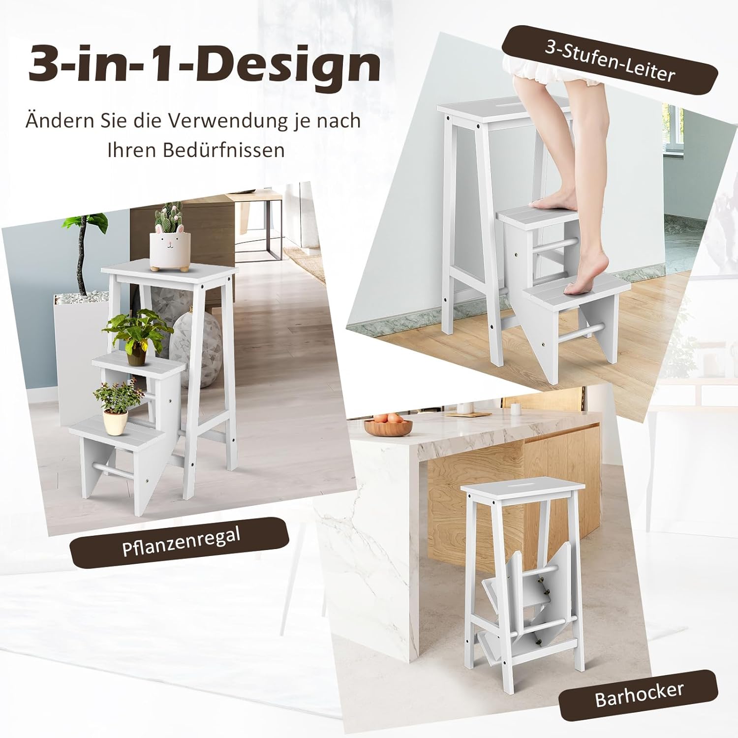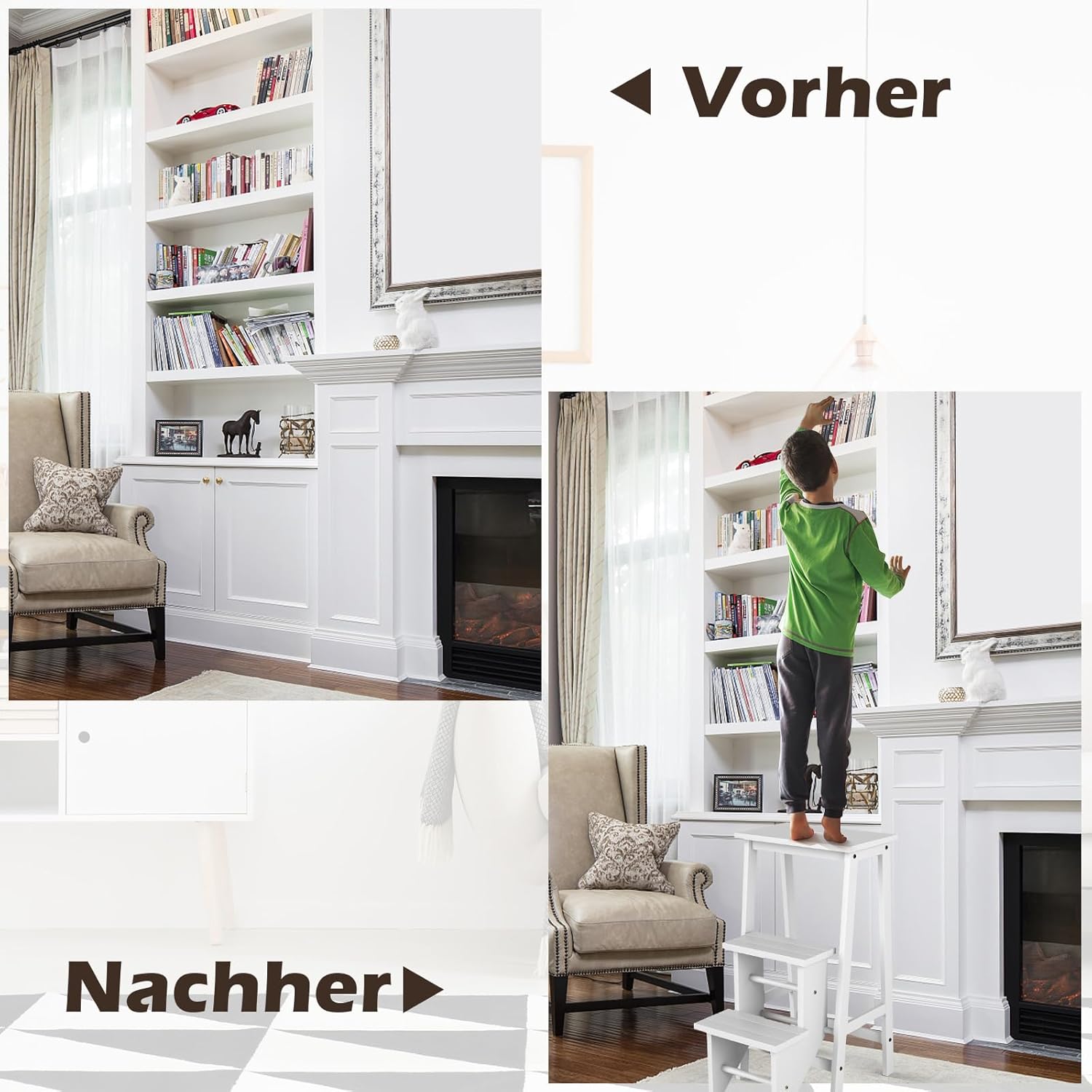 - 【Klappbarer 3-stufiger Tritthocker】Die beiden unteren Stufen können zur Aufbewahrung und Platzersparnis durch einen Klappmechanismus nach innen gedreht werden. Ansonsten kann der Platz unter den Stufen auch zum Platzieren ungenutzter Gegenstände