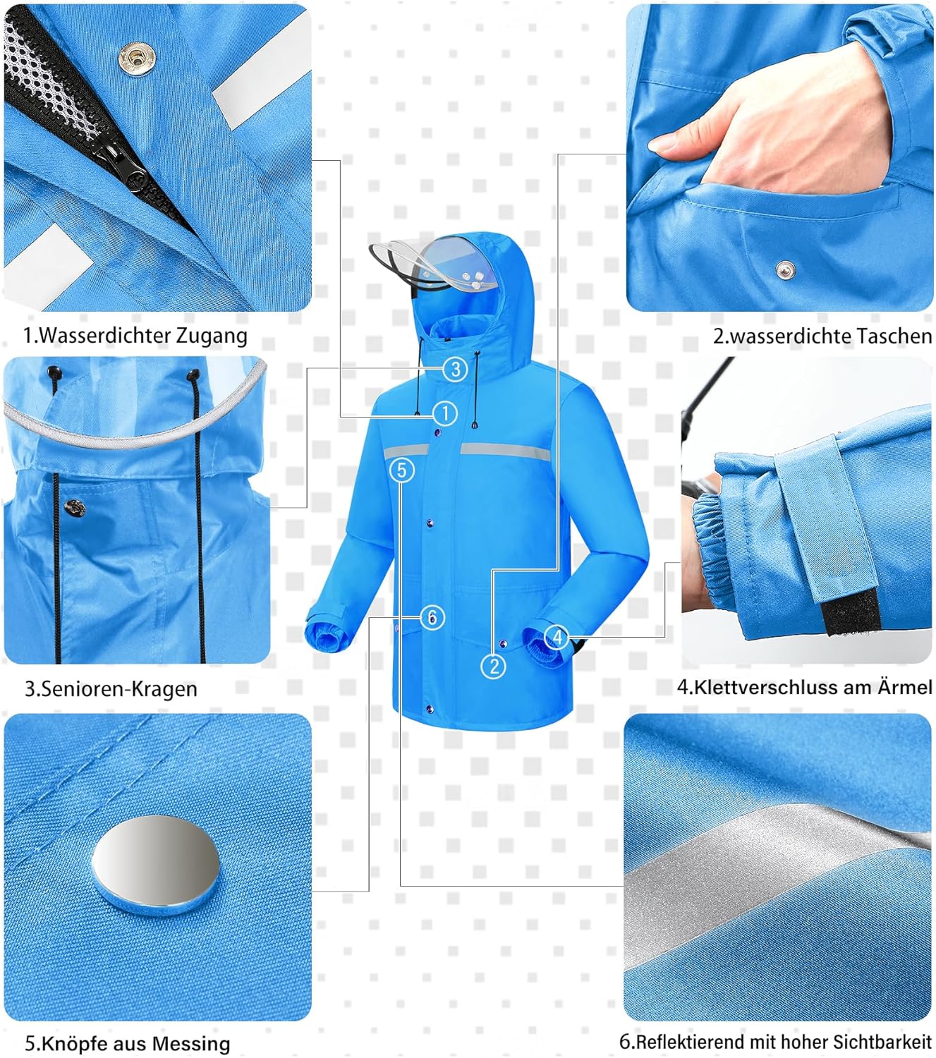 - Sicherheit: Um Ihre Sicherheit bei Nacht im Regen zu gewährleisten, haben wir vor und nach dem Regenmantel hochfeste reflektierende Streifen entwickelt, die eine unscharfe Sicht auf die regnerischen Tage ermöglichen und es anderen ermöglichen, Ihre
