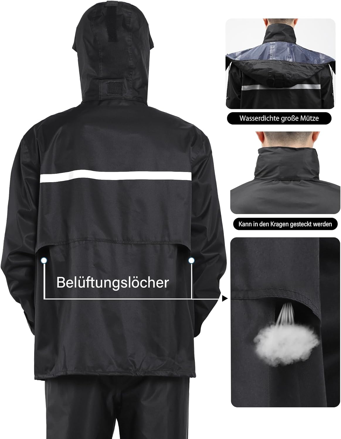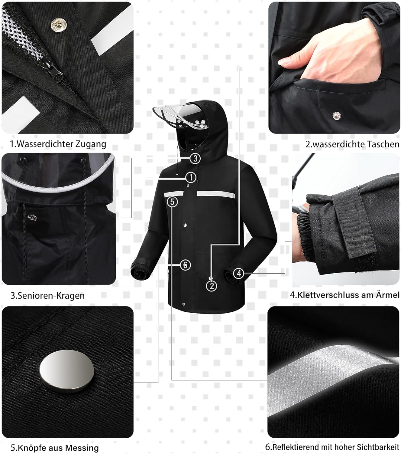 - Sicherheit: Um Ihre Sicherheit bei Nacht im Regen zu gewährleisten, haben wir vor und nach dem Regenmantel hochfeste reflektierende Streifen entwickelt, die eine unscharfe Sicht auf die regnerischen Tage ermöglichen und es anderen ermöglichen, Ihre
