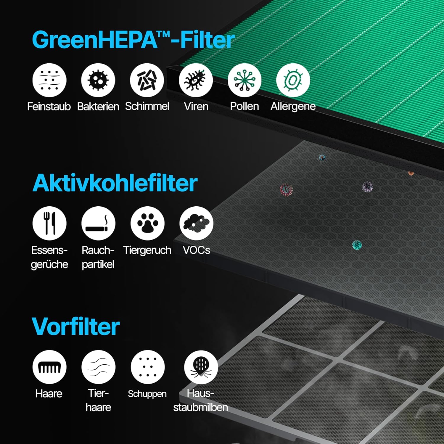 - FÜR SAUBERE ATEMLUFT BIS ZU 73 m²: Dank des HyperCaptive Filters und GreenHEPA gibt es doppelten Schutz: Entferne bis zu 99,999 % der schädlichen Partikel mit einer Nano-Grösse bis zu 0,01 µm. Allergene, Bakterien, Tierhaare, Feinstaub, Milben, Schimmelpilze, Gerüche, Pollen, Viren werden eingefangen und direkt im GreenHEPA Filter unschädlich gemacht. PM10 u. PM2,5