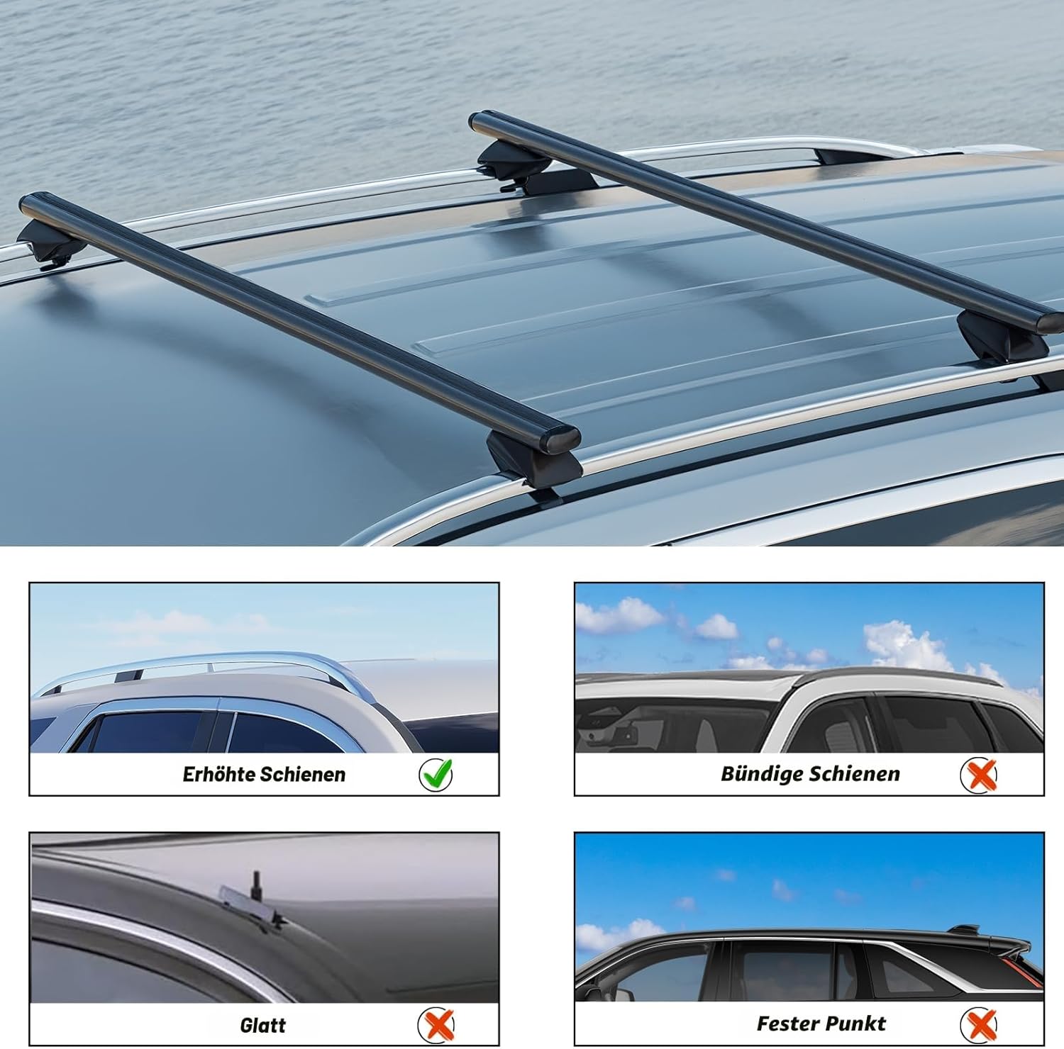 - Hinweise: Bitte stellen Sie vor dem Kauf sicher, dass es zu Ihrem Fahrzeug passt. Zur Sicherheit beim Tragen langer grosser Accessoires wie Surfbretter oder Skier verwenden Sie bitte spezielle Halterungen und Befestigungsvorrichtungen, um es am Rack zu