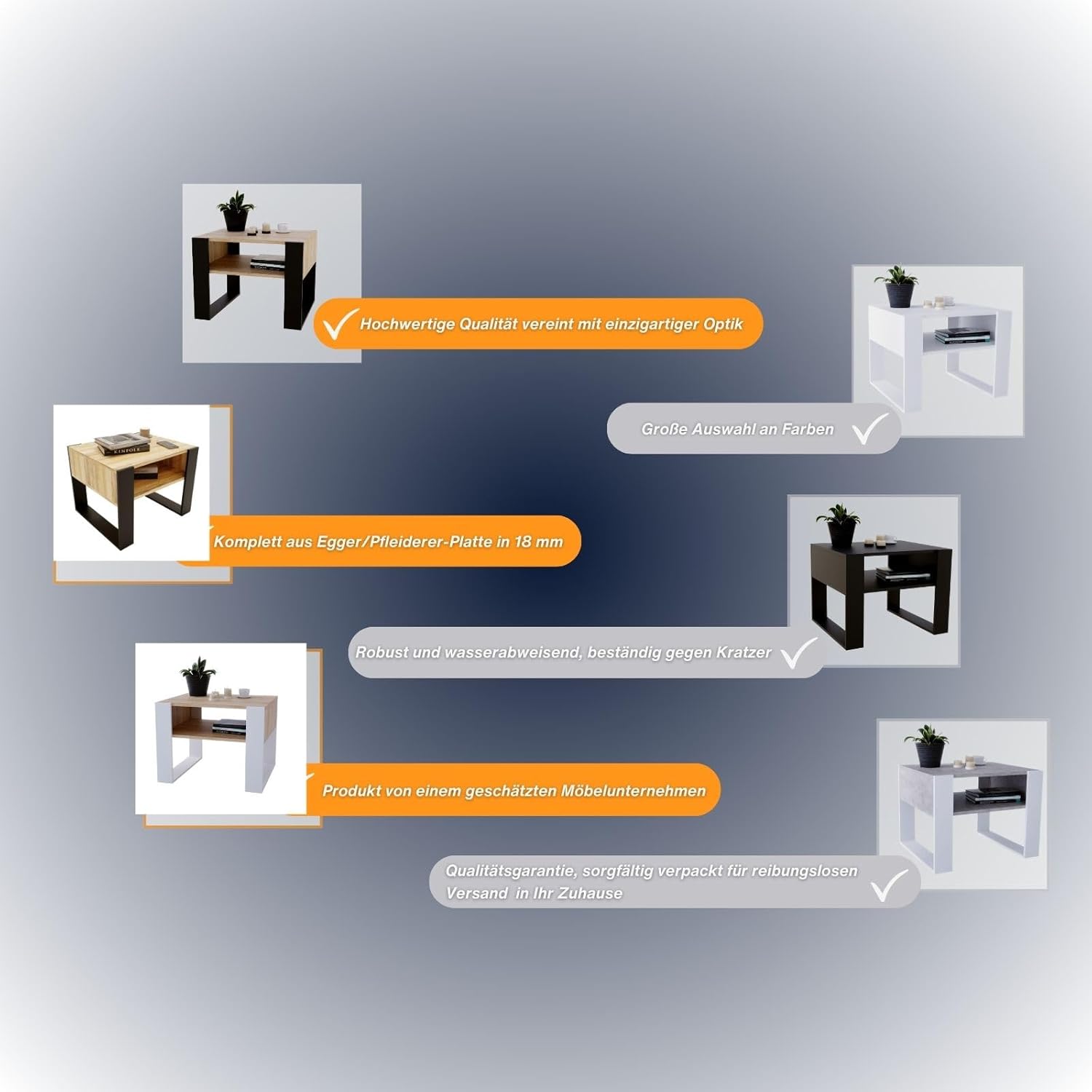 - VERARBEITUNG: Die Kanten sind mit einer 0,8 mm starken ABS-Kante von Egger versehen, die eine perfekte Passform mit der Platte garantiert. MAssE: Tischangaben Höhe: 45cm, Breite: 65cm, Tiefe: 53,6 cm. Regal Höhe: 16cm, Breite der Beine: 10cm