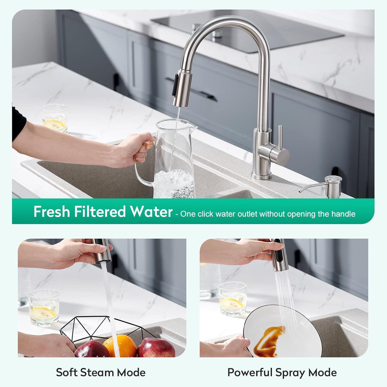 - 3 FUNKTIONEN BRAUSE: Die 3 Wege Mischbatterie Küche mit Brause verfügt über einen weichen Strahl, einen kräftigen Strahl und gefiltertes Wasser. Kombiniert mit der 360-Grad-Schwenkfunktion optimiert sie die Arbeitsabläufe in der Küche im hektischen