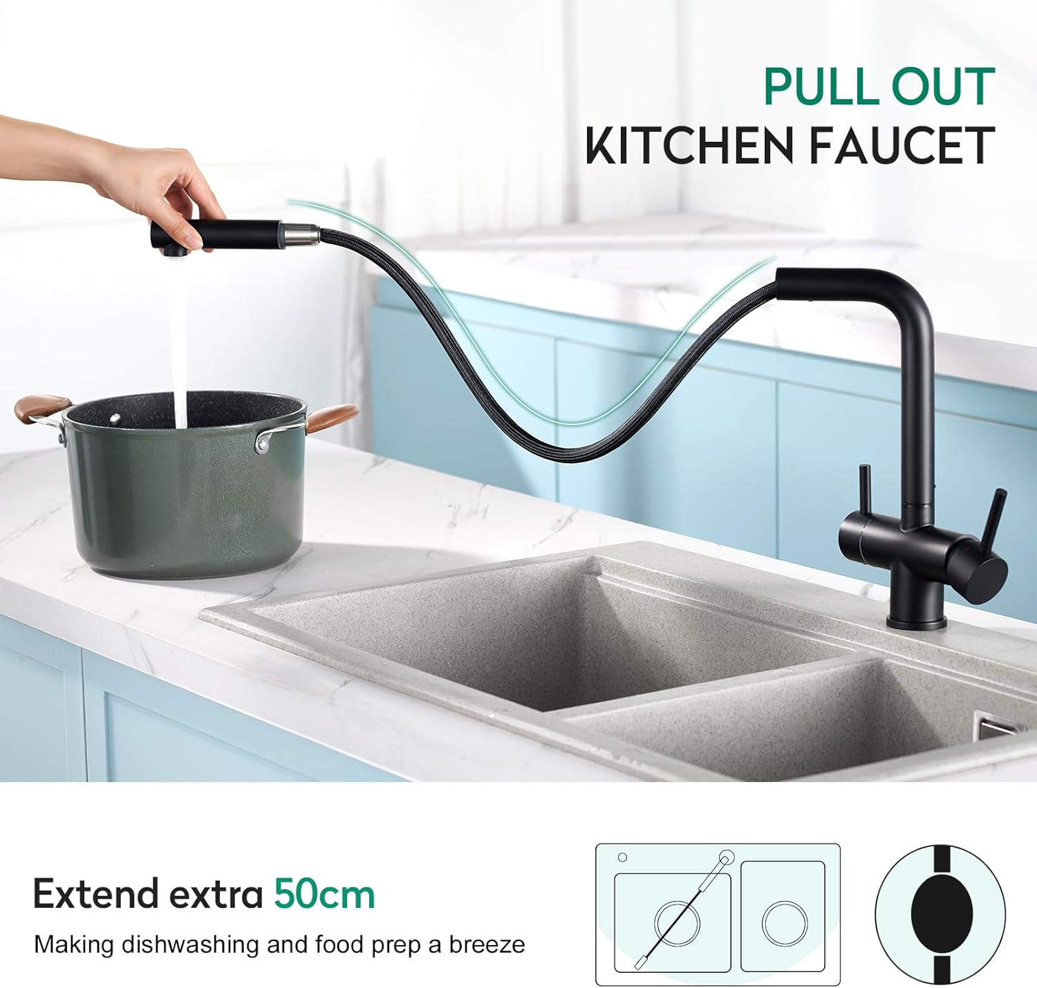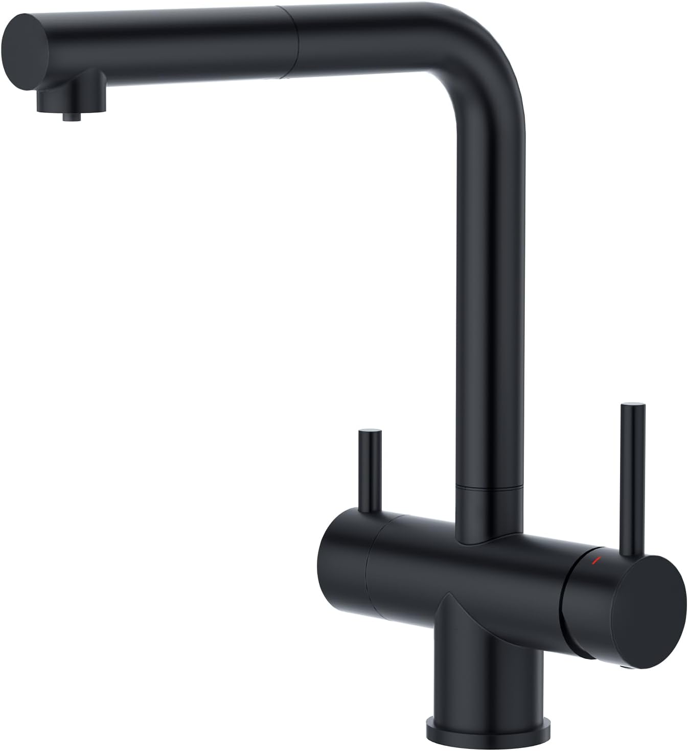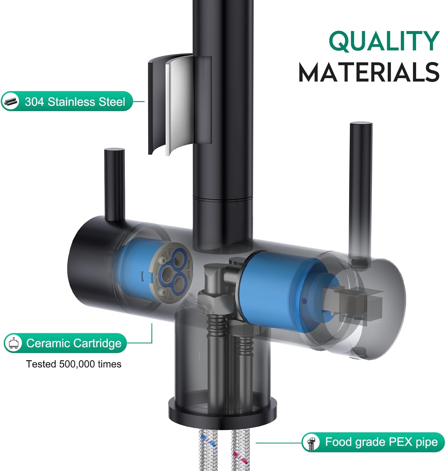 - EINLOCHMONTAGE UND DOPPELGRIFFBEDIENUNG: Im Vergleich zu herkömmlichen Trinkwasserhähnen spart unser ausziehbarer 3 Wege Küchenarmatur schwarz Platz und Geld. Zwei unabhängige Griffe zur Wasserkontrolle verhindern Verwechslungen. Die hochwertigen