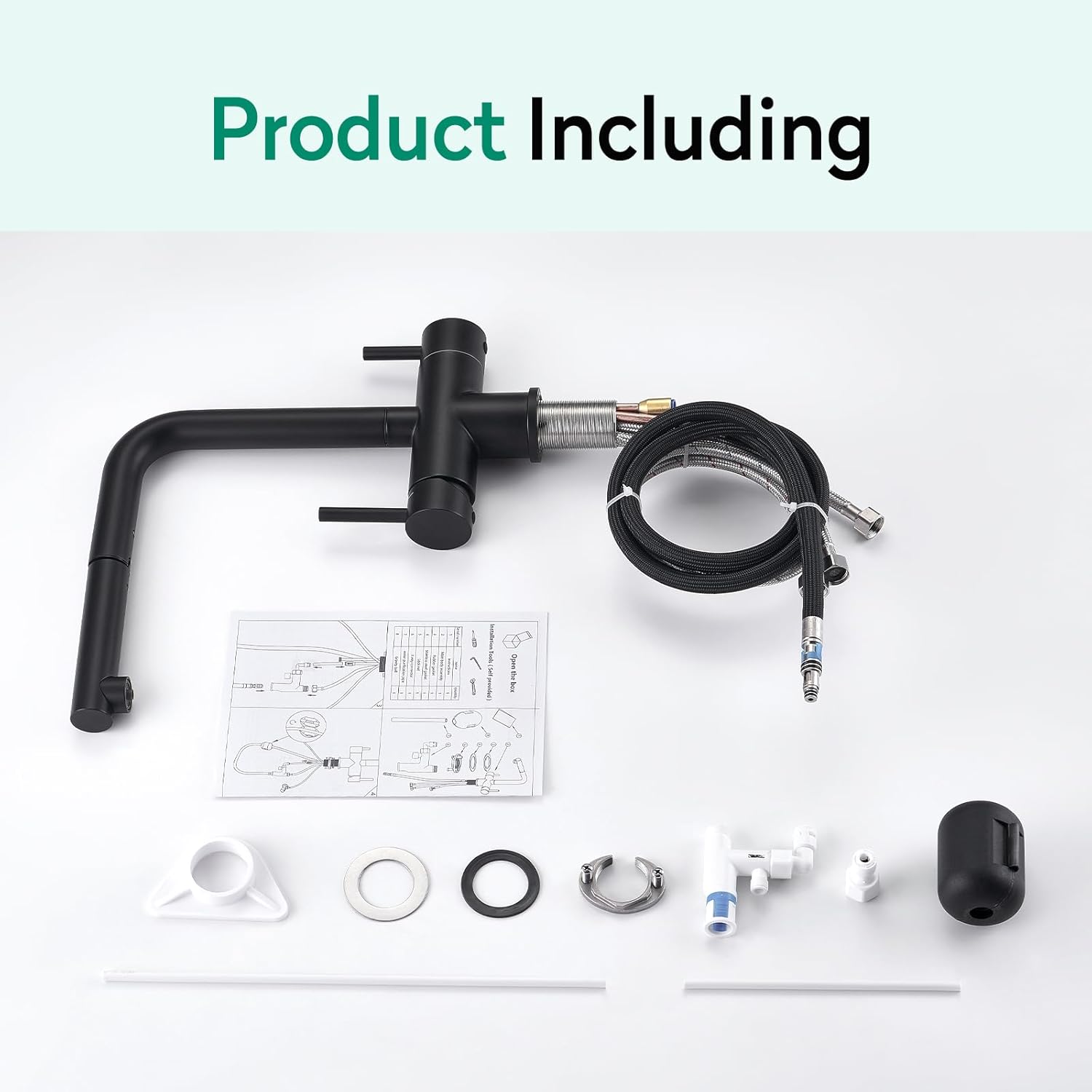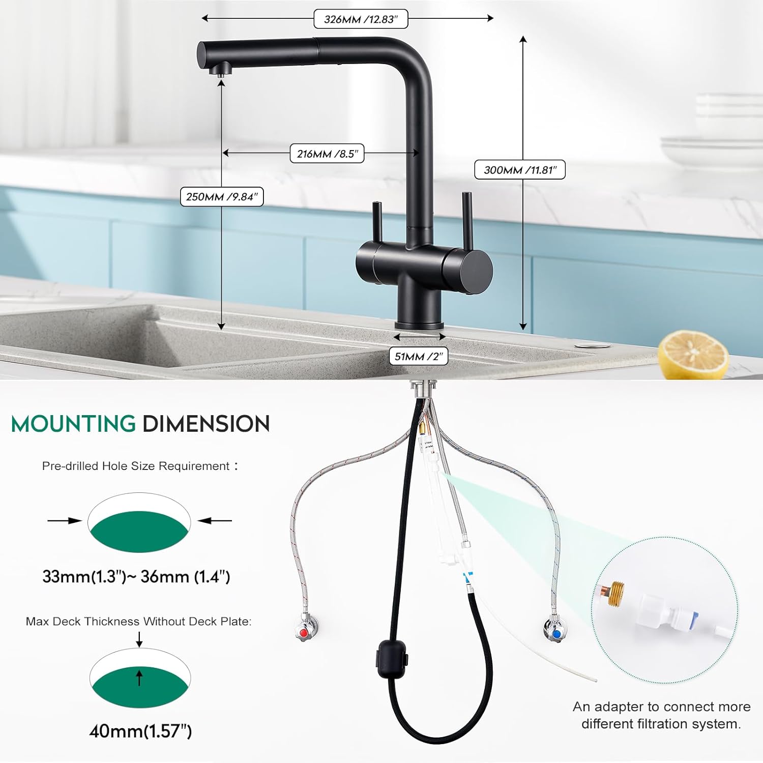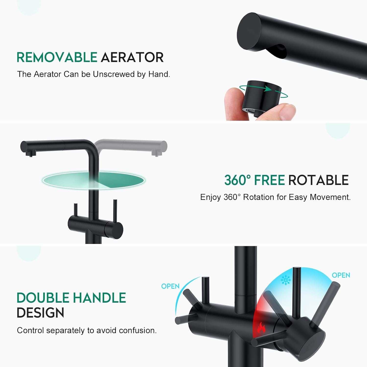 - EINLOCHMONTAGE UND DOPPELGRIFFBEDIENUNG: Im Vergleich zu herkömmlichen Trinkwasserhähnen spart unser ausziehbarer 3 Wege Küchenarmatur schwarz Platz und Geld. Zwei unabhängige Griffe zur Wasserkontrolle verhindern Verwechslungen. Die hochwertigen