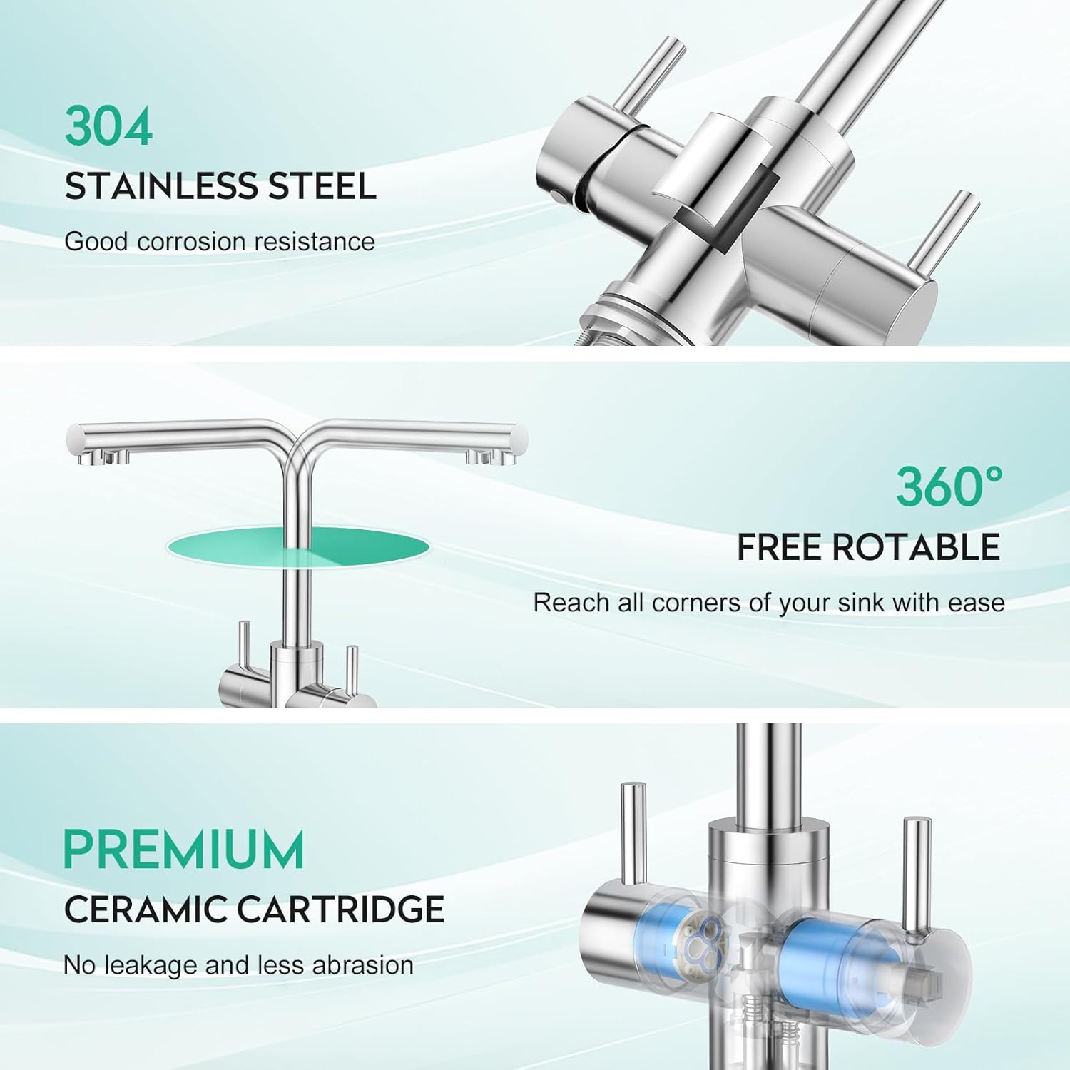 - EINZIGARTIGES DESIGN : Zwei Griffe, nicht leicht zu verwechseln; zwei Ausläufe, unabhängige Leitungen, keine Störung. Trinkwasserauslauf und Heiss- und Kaltwasserauslauf können einzeln oder kombiniert entladen und betrieben werden.