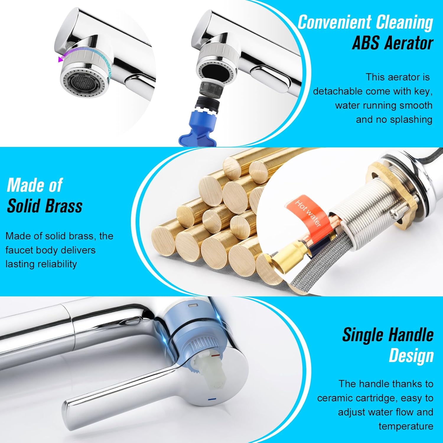 - [Elegantes Aussehen und Exquisite Verarbeitung] Die ganzen Waschtischarmatur besteht aus Bleifreie Messinggehäuse. Das Gewicht von 1,41 kg ist schwerer als die meisten Wasserhähne auf dem Markt. Die polierte verchromte Oberfläche sieht sehr edel aus