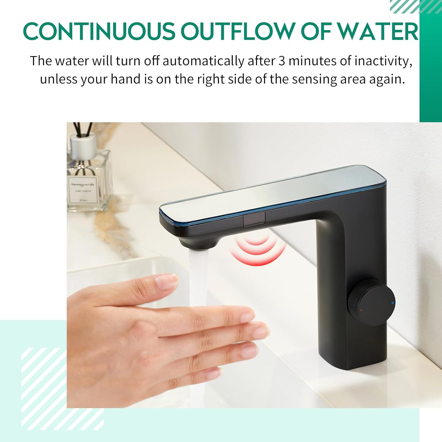 - Design mit zwei Sensorzonen: Dieser Wasserhahn Bad verfügt über zwei Sensorzonen, eine vordere und eine seitliche. Der Frontsensor ermöglicht eine berührungslose Bedienung, indem Sie einfach Ihre Hand vor den Sensor halten, um den Wasserfluss zu