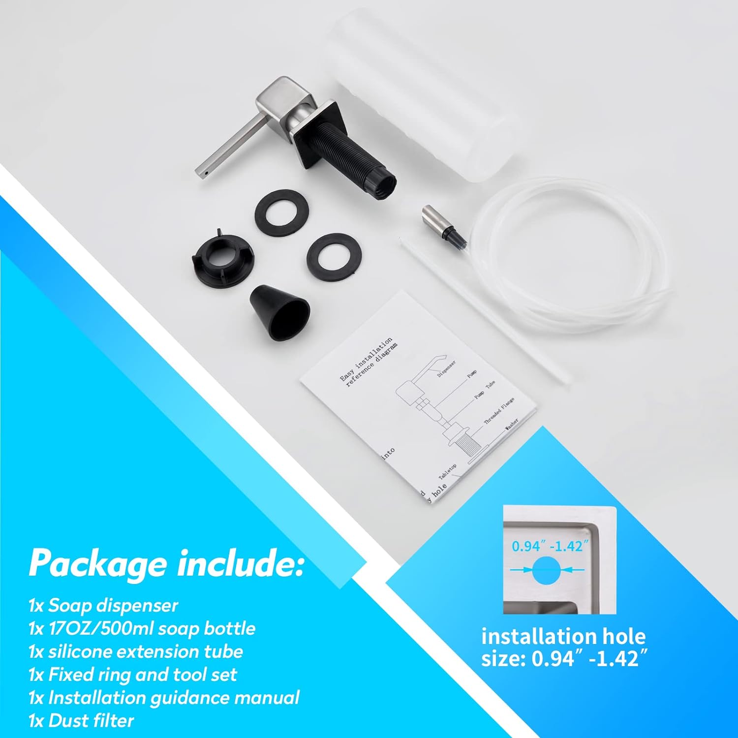 - HERSTELLERGARANTIE: Das Seifenspender Set enthält 1×Seifenspender Küche, 1×500 ml Seifenflasche, 1×1,0 m Schlauch, 1×Staubfilter, 1×Anleitung. Wir bieten 1 Jahre Garantie für diesen Spülmittelspender für Spülbecken. Wenn Sie irgendwelche