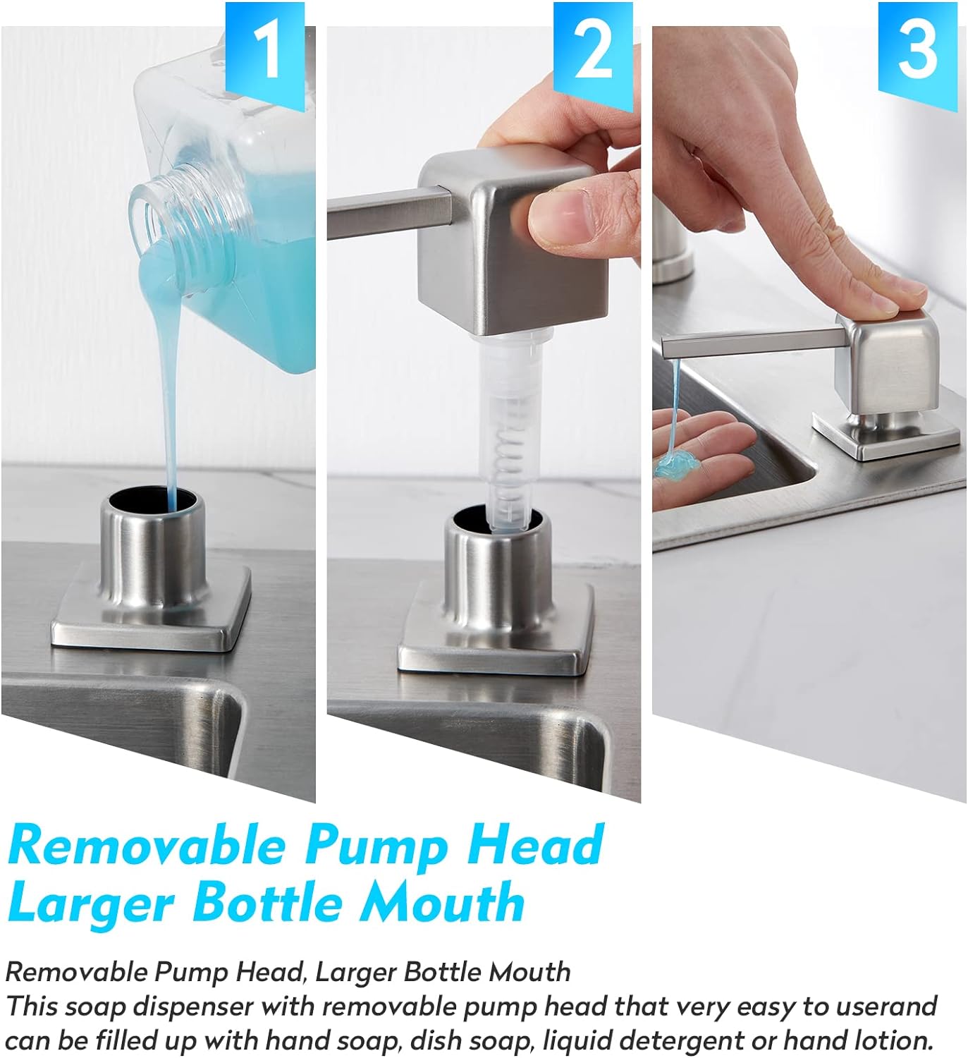 - MEHRZWECK: Der Seifenspender kann mit Desinfektionsmittel, Spülmittel, Handdesinfektionsmittel, anderen flüssigen Reinigungsmitteln usw. gefüllt werden. Er ist einfach in Küche, Bad, Spüle oder Arbeitsplatte (Granit, Marmor, Edelstahl, Holz usw.) zu