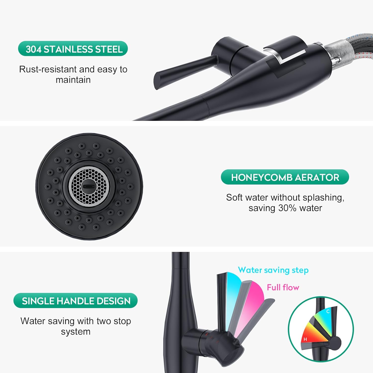 - HOCHWERTIGE QUALITÄT: Der ausziehbare Wasserhahn Küche Schwarz aus Edelstahl, der mit Neoperl ABS Belüfter, Keramikkartusche und Anschlusschläuche mit den DVGW Zertifizierung hat, sorgt für gesundes Wasser.