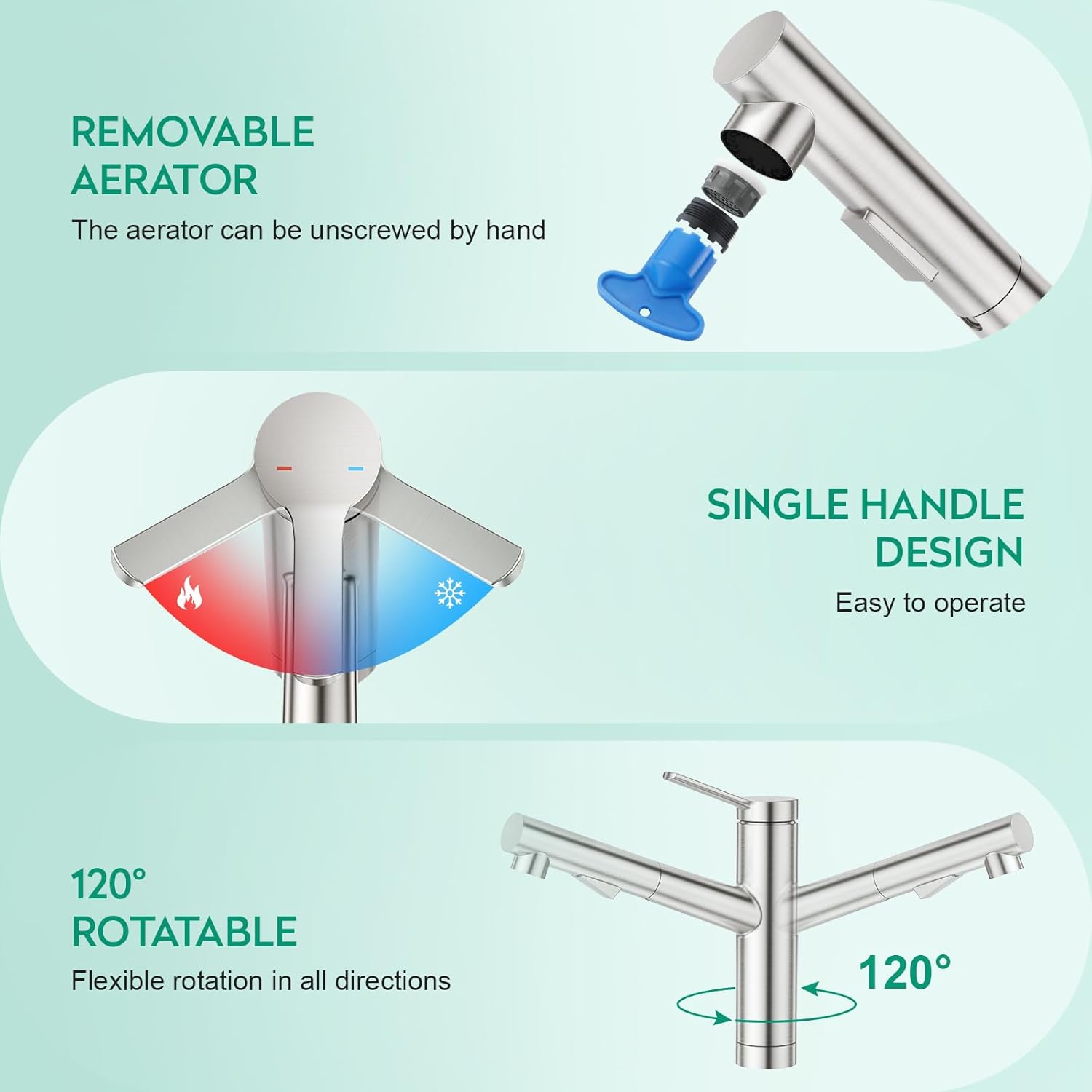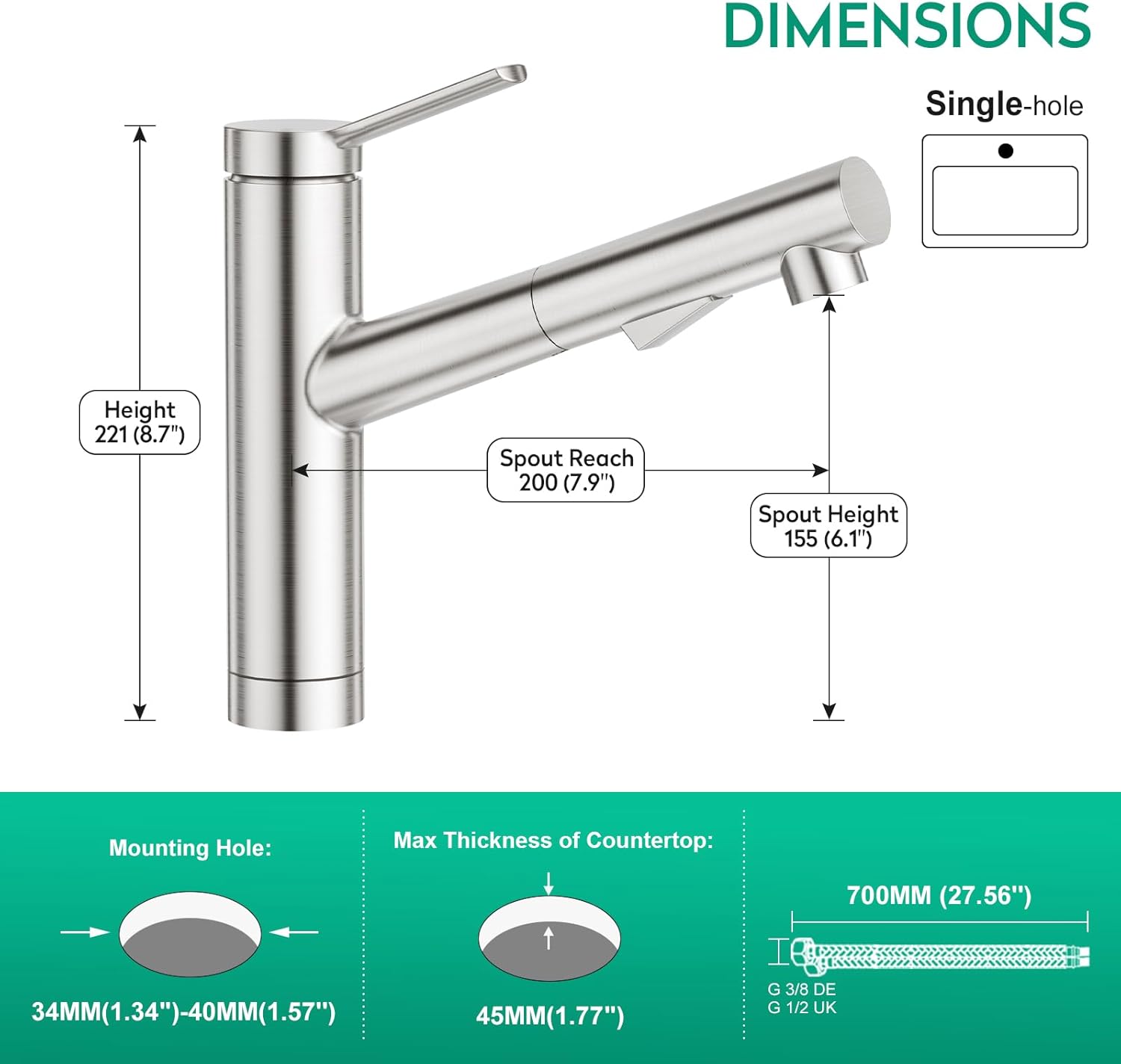 - MATERIAL: Die Küchenarmatur hat einen Duschkopf aus ABS-Kunststoff, der leicht zu bedienen ist. Die Küchenarmatur ist mit einem Wabenbelüfter und einer Keramikkartusche ausgestattet, um Spritzer und Lärm effektiv zu reduzieren.