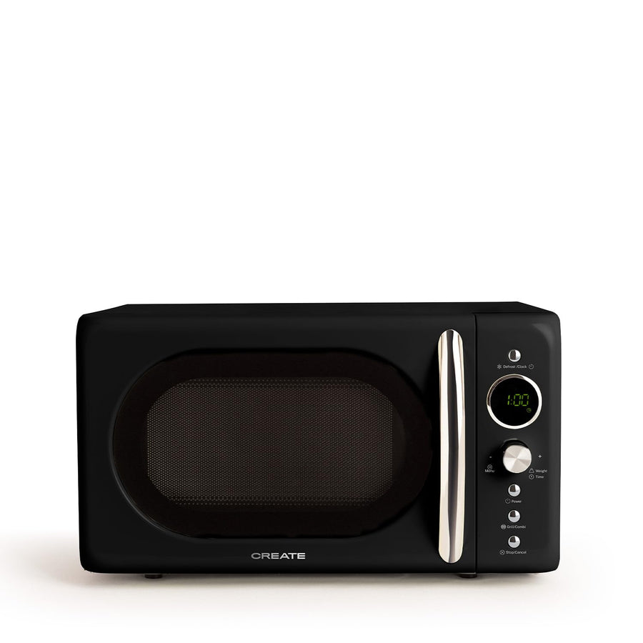- 🖌️|RETRO-STIL|Mikrowelle mit 20l Fassungsvermögen und Vintage-Design, mit Knöpfen und Griff in Chromoptik. Der Drehteller hat einen Durchmesser von 245 mm.