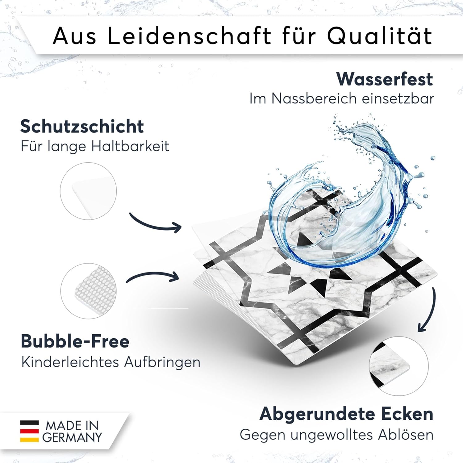 • HOCHWERTIGE VERARBEITUNG - Passgenauer Zuschnitt, hochwertige Druckverfahren und beste Materialien zeichnen unsere Fliesensticker aus. 100% Zufriedenheitsgarantie mit unseren Klebefliesen!