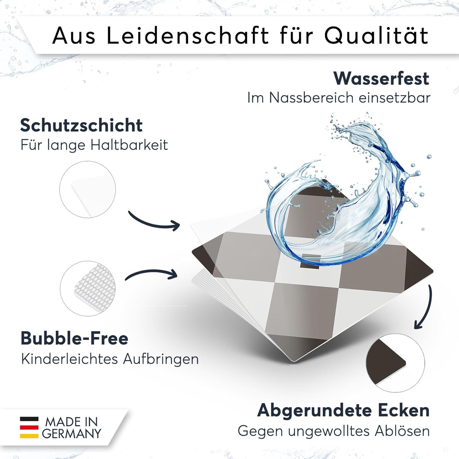 • HOCHWERTIGE VERARBEITUNG - Passgenauer Zuschnitt, hochwertige Druckverfahren und beste Materialien zeichnen unsere Fliesensticker aus. 100% Zufriedenheitsgarantie mit unseren Klebefliesen!