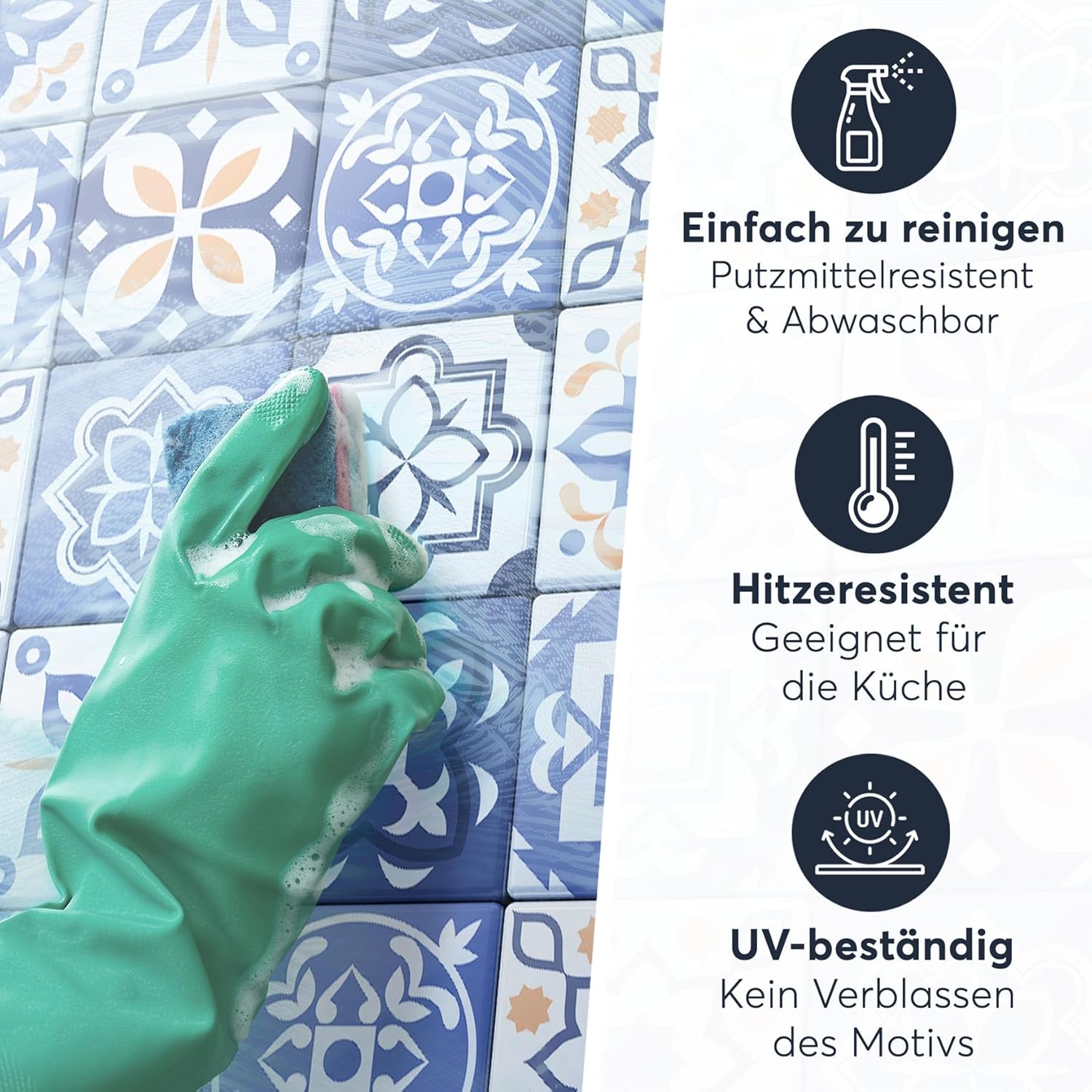 • HOCHWERTIGE VERARBEITUNG - Passgenauer Zuschnitt, hochwertige Druckverfahren und beste Materialien zeichnen unsere Fliesensticker aus. 100% Zufriedenheitsgarantie mit unseren Klebefliesen!