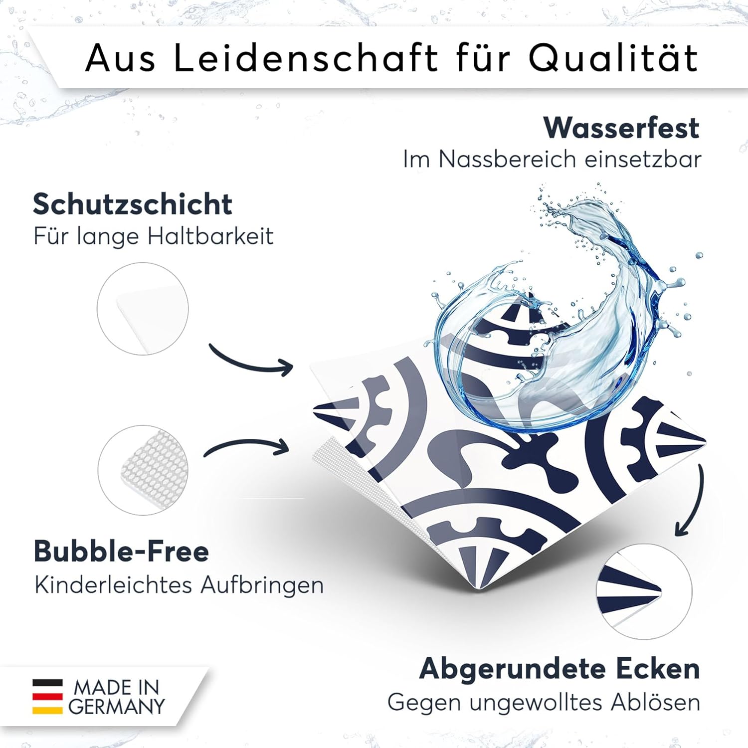 • HOCHWERTIGE VERARBEITUNG - Passgenauer Zuschnitt, hochwertige Druckverfahren und beste Materialien zeichnen unsere Fliesensticker aus. 100% Zufriedenheitsgarantie mit unseren Klebefliesen!