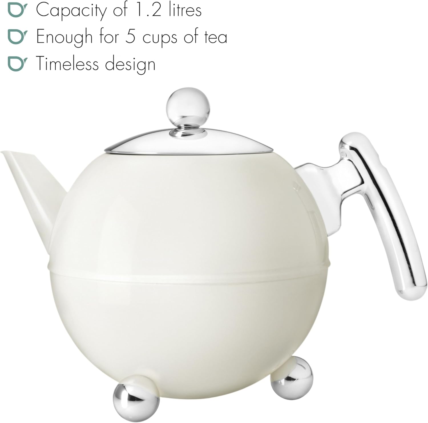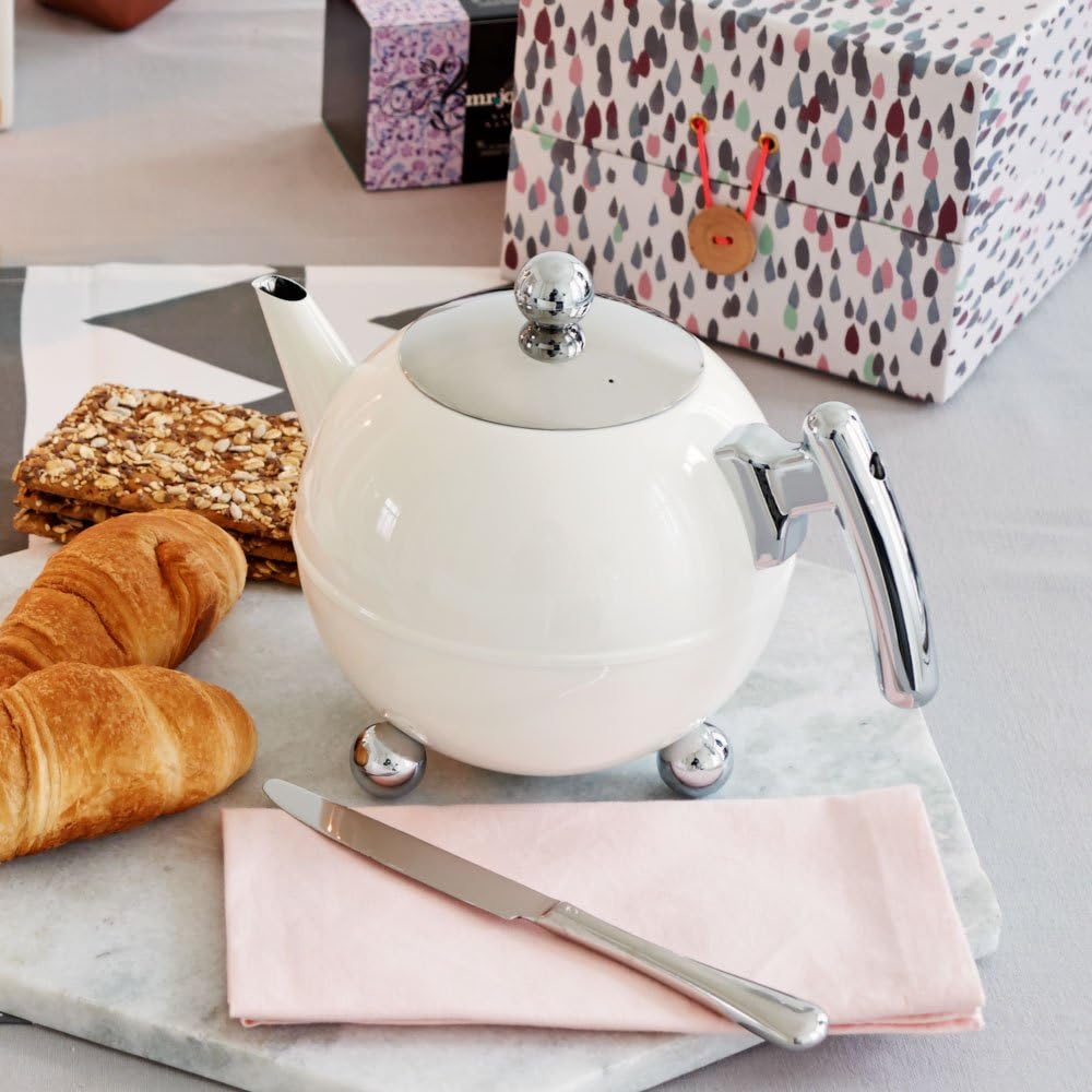 - Die creme-weisse runde Teekanne aus Edelstahl ist doppelwandig und isoliert Ihren Tee optimal