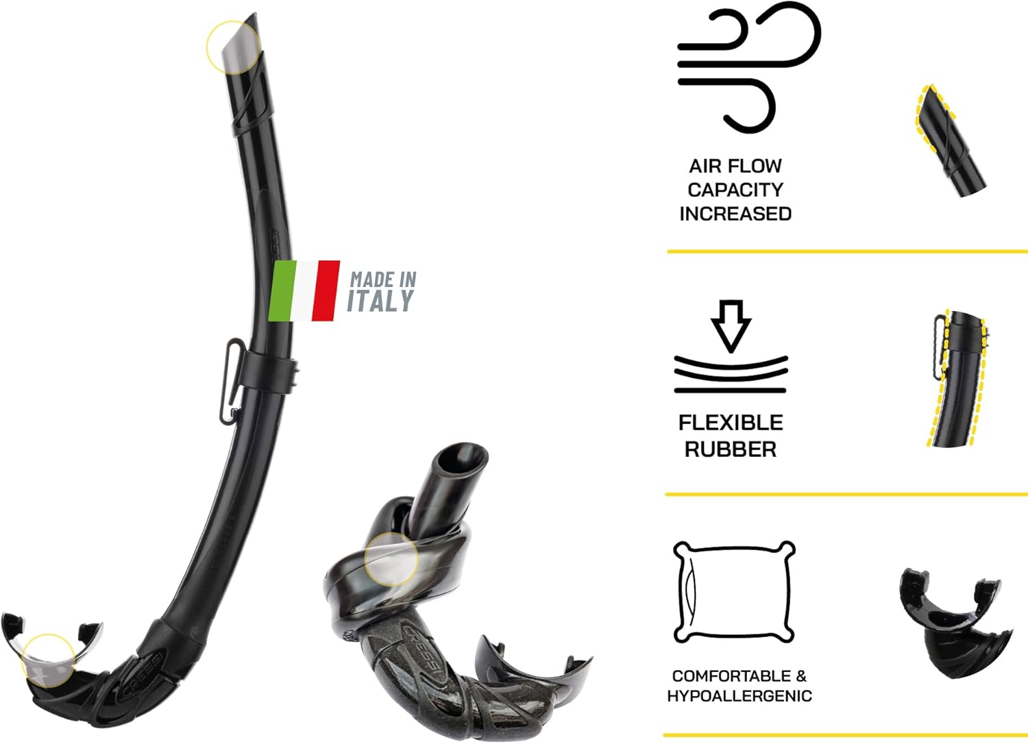 - Schnorchel Corsica: technologisch hochwertiger Schnorchel, der insbesondere für tiefe Apnoetauchgänge entwickelt wurde; hohe Flexibilität des Schnorchels beim Auftreten von Hindernissen; anatomisch geformter Mundstück aus antiallergischem Silikon