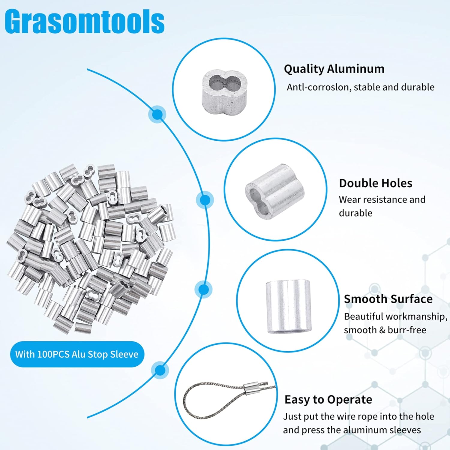 - 【𝗣𝗮𝗰𝗸𝗮𝗴𝗲 𝗜𝗻𝗰𝗹𝘂𝗱𝗲𝗱】 1 hochpräzises Drahtseil-Crimpwerkzeug mit einem 100-teiligen Aluminium-Doppelhülsen-Crimpschlaufen-Hülsensatz. HINWEIS: 1. Das Crimpwerkzeug kann nur an Aluminiumhülsen von 3/32" und darunter gecrimpt werden. 2. Der Schneidabschnitt kann nur Drahtseile von 1/16" und darunter schneiden.